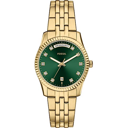ANGEBOT Fossil Herrenuhr mit Edelstahlgehäuse, grünem Zifferblatt und goldenem Armband.