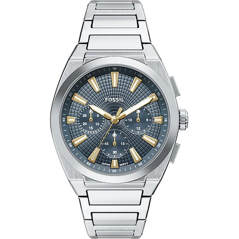 Fossil Herrenuhr mit Edelstahlgehäuse und blauem Zifferblatt.