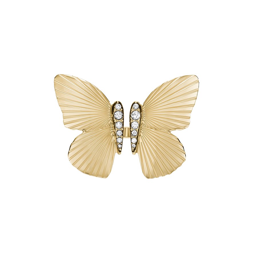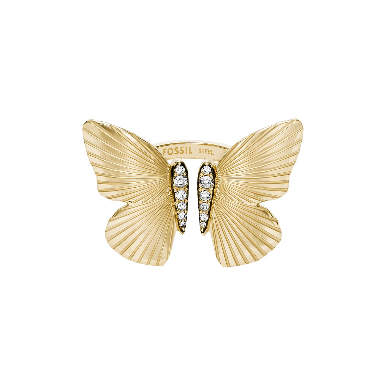 Ein absolutes Must-Have für modebewussten Damen: Der stylische Damenring aus der JEWELRY-Kollektion von Fossil aus Edelstahl in der Farbe Gold, auf dem der Besatz mit Glasstein begeistert. Die Oberfläche ist mit einer haltbaren und abriebfesten Edelmetall-Beschichtung in der Farbe Gold veredelt und poliert. Für Frauen, die sich ein Accessoire mit Persönlichkeit und Stil wünschen: Dieser Ring vereint Eleganz und Klasse.