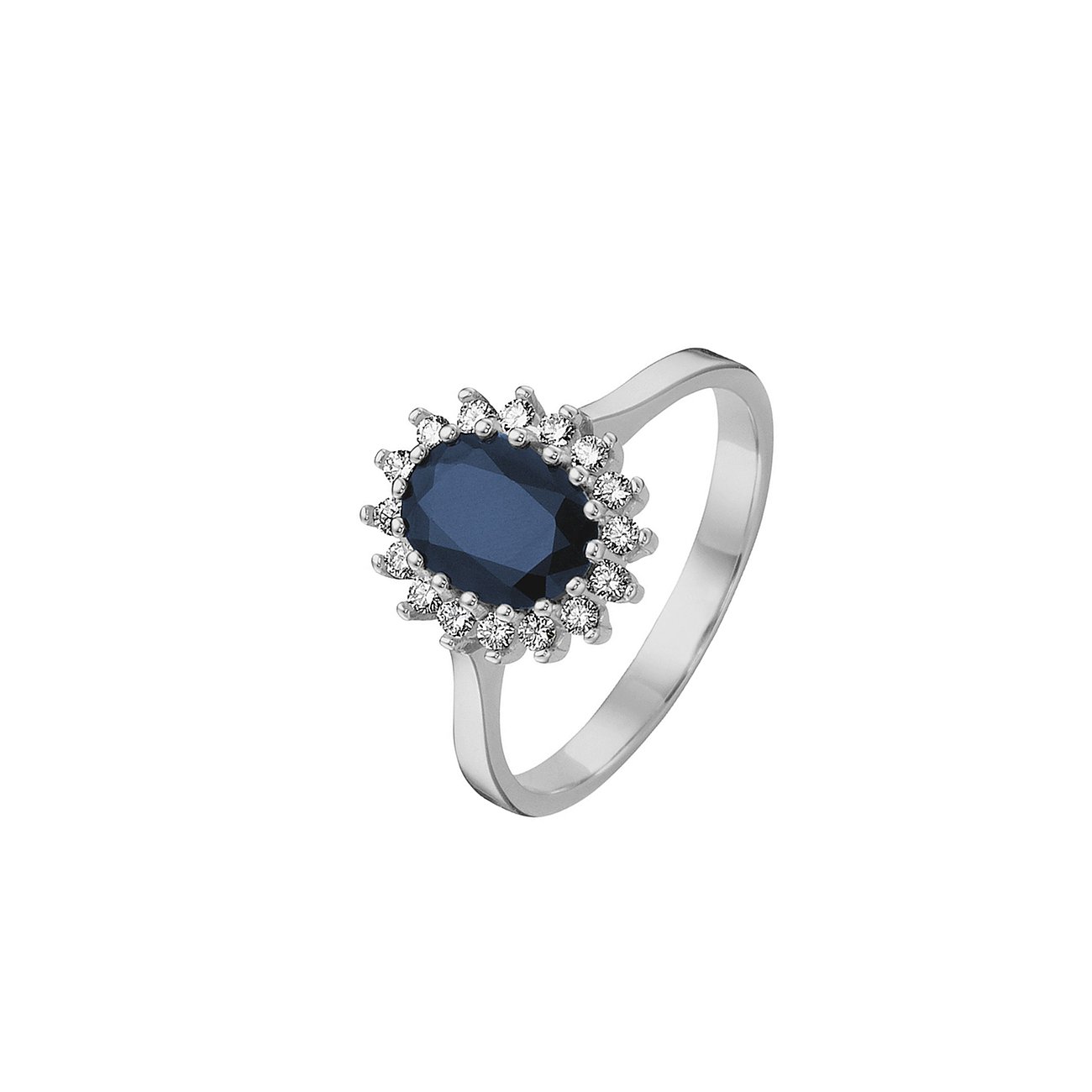 Nicht nur seine Farbe macht diesen Ring zum Blickfang. Wahrlich brillant ist auch die Fassung des ca. 11 x 9 mm großen Saphirs: mehrere Brillanten, zus. ca. 0,20 ct.* und 585er Weißgold lassen ihn noch intensiver strahlen. Ringschienenbreite ca. 0,3 cm.