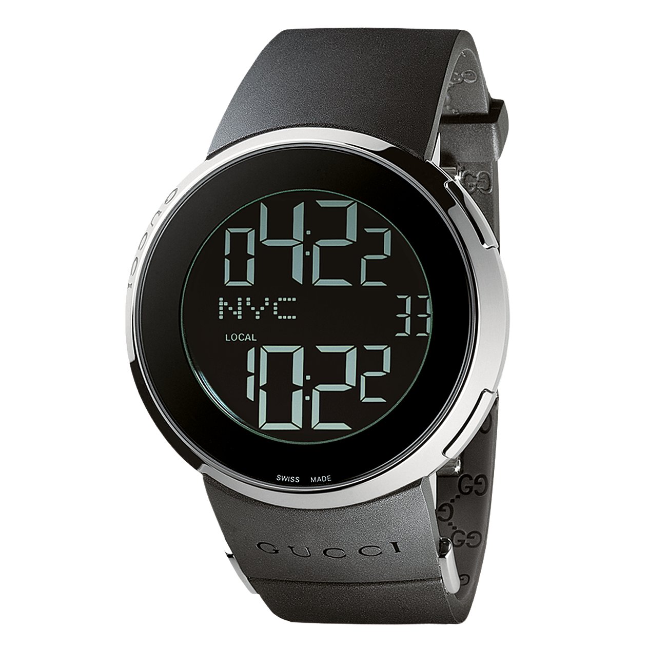 Die I-Gucci-Kollektion verbindet innovatives Design mit sportlicher Eleganz. Große digitale Ziffern geben leuchtend die Zeit wieder. Zudem werden zwei Zeitzonen, Datum und Alarm angezeigt. Im Inneren der Uhr (44 mm Durchmesser) befindet sich ein Swiss-made-Automatikwerk, der verschraubte Gehäuseboden und kratzfestes Saphirglas mit Entspiegelung schützen das Ziffernblatt vor Schmutz und Wassereinfluss bis zu 5 Bar. Ein breites, unverkennbares Kautschukarmband hält diese attraktive Uhr am Handgelenk - eine perfekte Kombination aus Stil und Funktionalität.