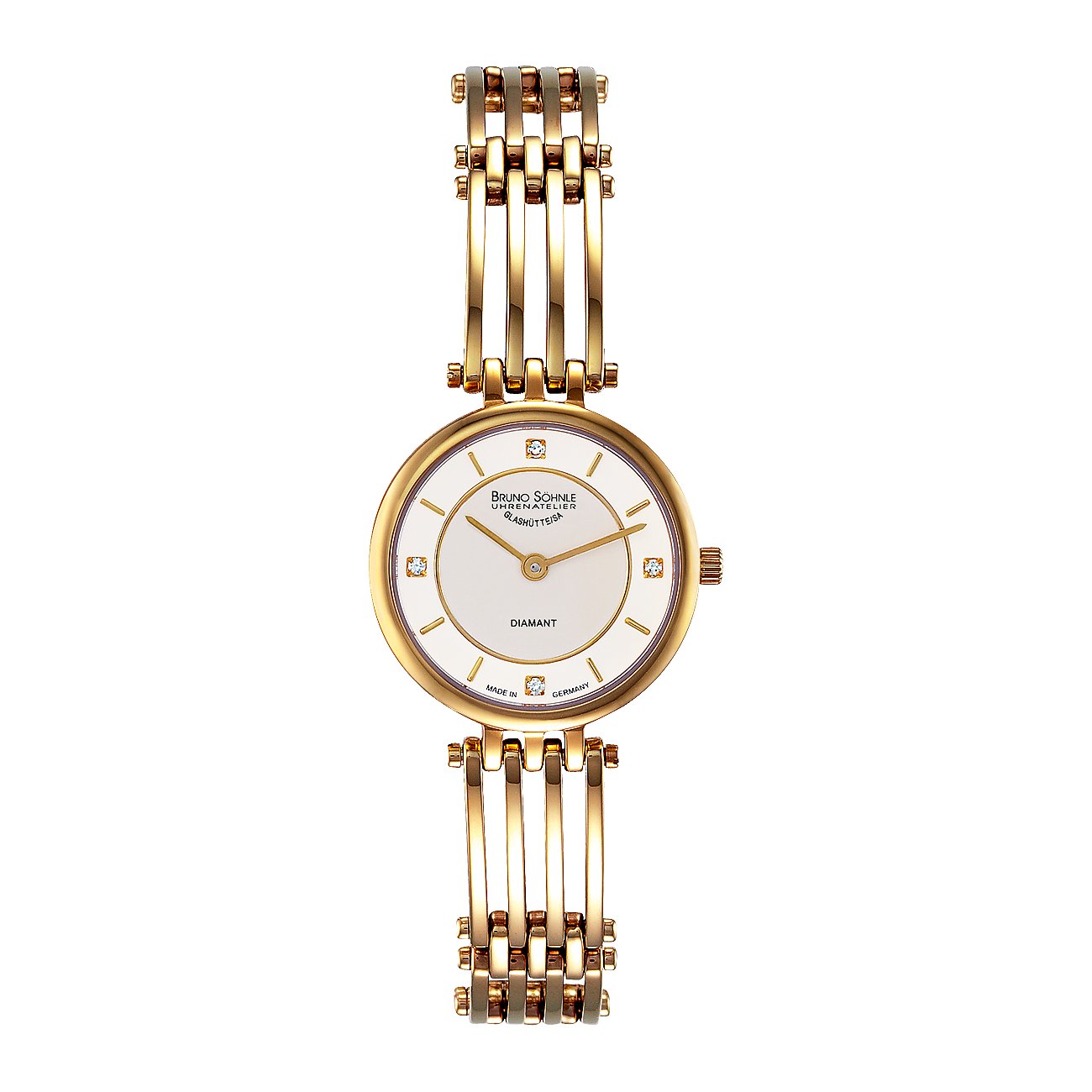In den Uhren von Bruno Söhnle vereinen sich moderne Technologie und traditionelle Handwerkskunst. Gefertigt im sächsischen Glashütte sind die Uhren für die überragende Präzision ihrer Werke bekannt. Sportliche Eleganz gefragt? Dann hat die LATINA 2 das Zeug, zur neuen Lieblingsuhr zu werden! Die hochwertige Damenuhr mit Edelstahl-Gehäuse bringt ungezwungenen Luxus ans Handgelenk. Das zeitlose, stilvolle Design passt perfekt zu legeren Freizeit-Outfits, komplettiert aber auch mühelos Business-Dresses oder festliche Looks. Auch das silberfarbene Armband aus Plaque trägt seinen Teil dazu bei, diese Uhr zum stilistischen Allrounder zu machen. Es garantiert außerdem bequemen Tragekomfort und robuste Langlebigkeit. Mit einem Gehäusedurchmesser von 25 mm nimmt die Latina II am liebsten an schmalen Handgelenken Platz. Das silberfarbene Zifferblatt mit Markierungen fügt sich gekonnt in das Gesamtdesign ein. 4 Diamanten sorgen für ein aufregendes Funkeln auf dem Zifferblatt. Für den Schutz des Zifferblattes wurde der "König der Uhrengläser" verwendet: Saphirglas. Dieses synthetische Material ist so gut wie nicht zu zerkratzen und äußerst robust. Saphirglas ist außerdem quasi immun gegen Stöße und Schläge. Das Ronda-Quarzwerk im Inneren sorgt für zuverlässige Präzision. Durch die Wasserdichte von 3 bar ist die Uhr spritzwassergeschützt und kann beim Händewaschen problemlos am Handgelenk verbleiben. Sicheren Halt und gute Verstellbarkeit garantiert die Butterfly-Faltschließe.