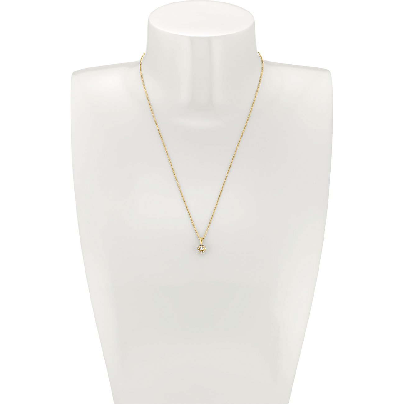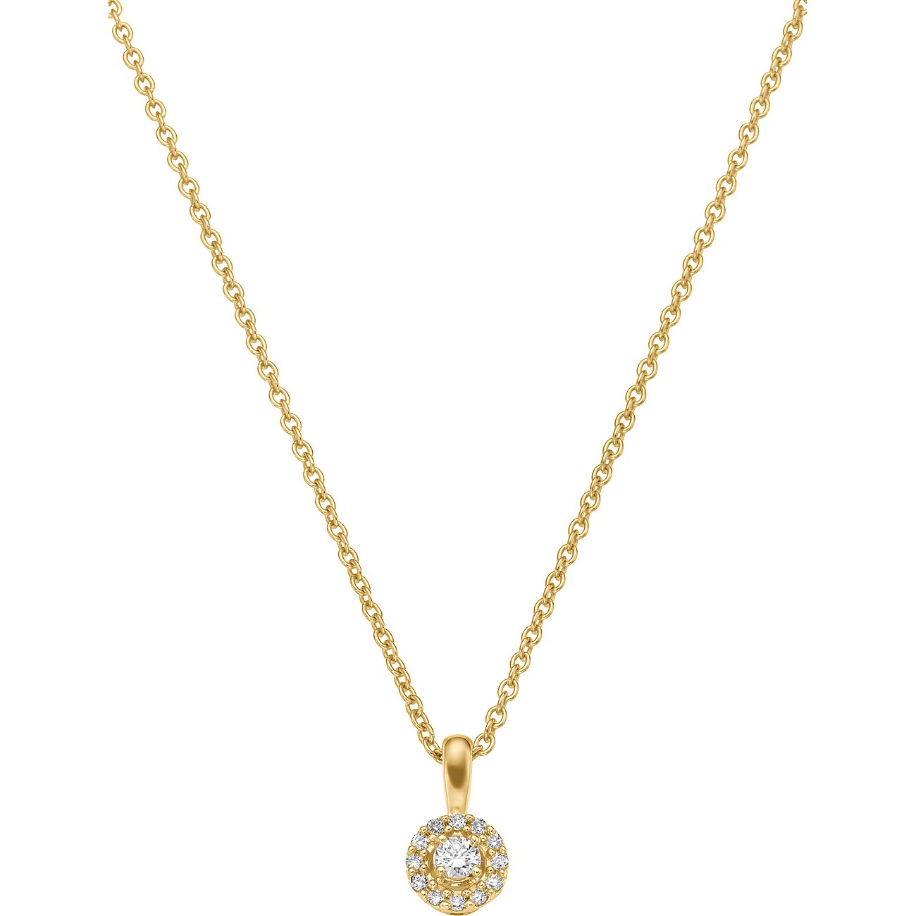 Einen ganz intensiven Akzent, gerade zu Kleidern in dunkleren Farbtönen, setzt dieses Collier mit rundem Anhänger, weil sich seine Leuchtkraft mit dem größeren Brillanten in der Mitte und den kleineren ringsum so wunderbar konzentriert. Der Anhänger ist wie die Ankerkette aus hochwertigem 333er Gelbgold gefertigt. Länge des Colliers: ca. 45 cm.