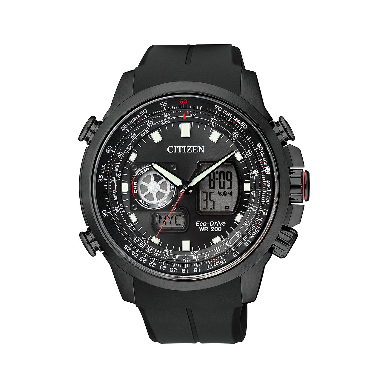 Citizen Promaster SKY JZ1065-05E 47 mm im Durchmesser und 14 mm in der Höhe misst das Gehäuse dieses ins Auge stechenden Alarmchronographen. Ausgestattet mit zahlreichen Zusatzfunktionen wie Alarmfunktion, Datumsanzeige, Perpetual Calender, lumineszierende Zeiger und Indizes, Stoppuhr. Ortszeit für 30 Städte, Zwischenzeitfunktion, etc. ist dieser Chronograph mehr als eine gewöhnliche Uhr. Als Material für das Gehäuse (mit verschraubtem Boden) wurde schwarz beschichteter Edelstahl verwendet. Angetrieben wird diese Quarz-Uhr durch eine spezielle, eigens von Citizen entwickelte Technik, der Eco-Drive-Technologie. Sonnenlicht und, das ist das Besondere, auch künstliches Licht werden als Energiequelle genutzt. Eine unter dem digital und analogen Ziffernblatt liegende Solarzelle fängt beide Strahlungen auf, wandelt sie in elektrische Energie um und schafft so eine Gangreserve von 240 Tagen. Gehalten wird diesen mit einem Kautschuk Armband (mit Dornschließe)