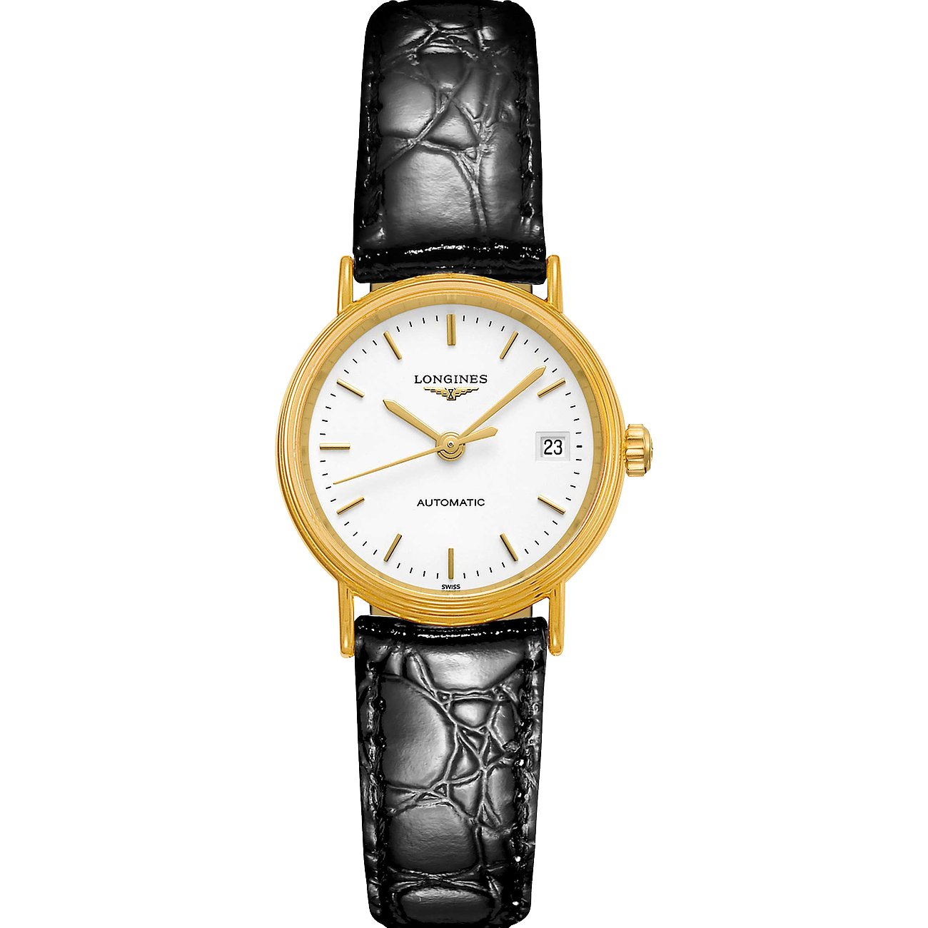Gegensätze ziehen sich an: Das matte Schwarz des Lederarmbandes im Kroko-Stil ist der passende Kontrast, um das goldfarbene Gehäuse noch besser in Szene zu setzen. Denn dort hat Longines, wie bei der Présence-Kollektion üblich, eine zwar dezente, aber extrem edle Linienführung auf das weiße Ziffernblatt gezaubert. Die aufgesetzten und polierten Indizes sowie Zeiger passen sich dem Design kunstvoll an. Die Krone setzt sich erhaben ab. Eine Uhr, die auffällt.