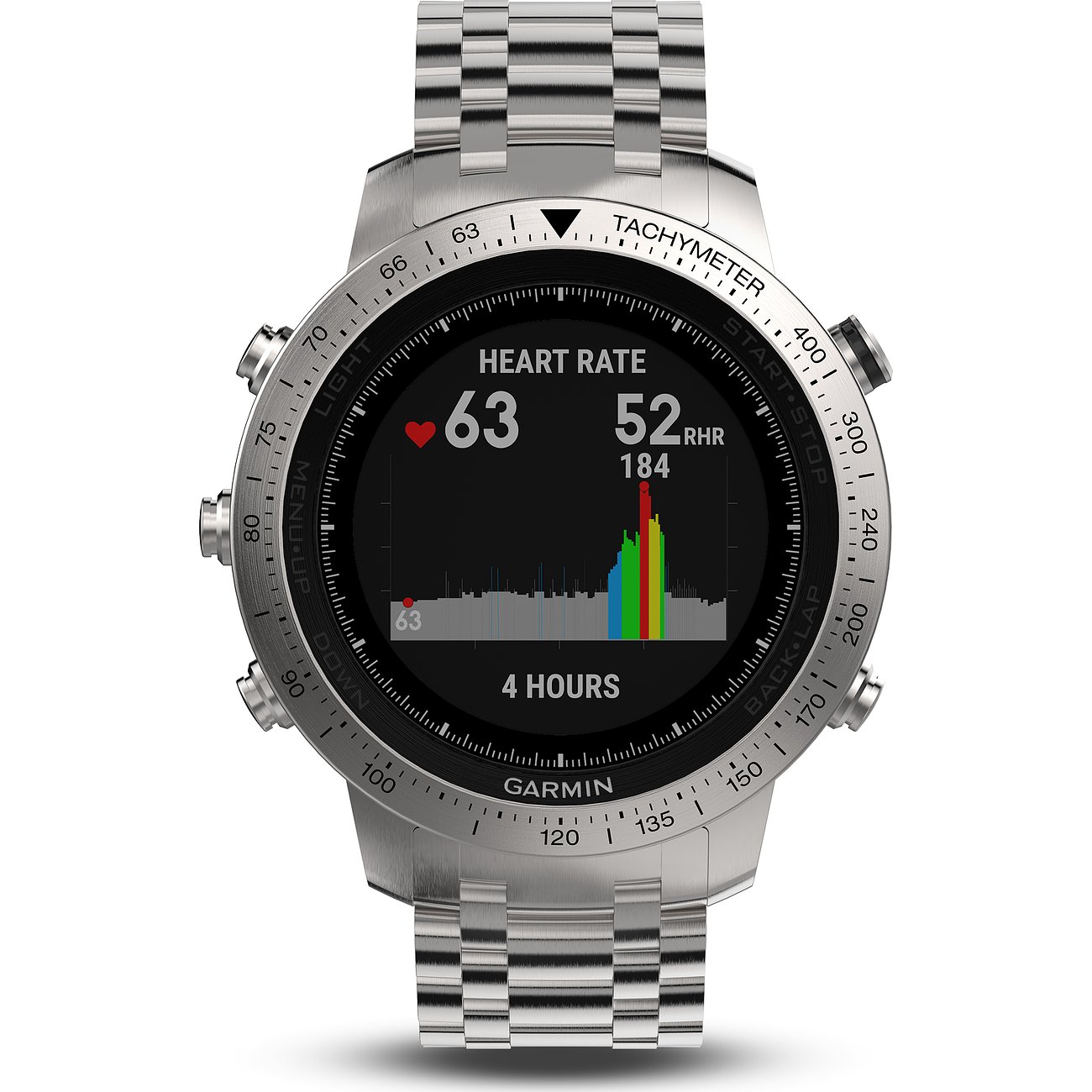 Das Gehäuse dieses Modells besteht aus robustem, gebürstetem 316L-Edelstahl, die 49-mm-Lünette wird aus gebürstetem Edelstahl gefertigt. Ausgestattet mit einer Tachymeter-Skala und verschiedenen Sensoren wie Hochleistungs-GPS und GLONASS Satellitenempfänger, erweiterte ABC-Sensoren (Höhenmesser, Barometer, Kompass) und optische Sensoren zur Herzfrequenzmessung am Handgelenk, eignet sich die Uhr ideal für jegliche Sport und Outdoor-Aktivitäten. Mit einer Wasserdichtigkeit von 10 Bar (entspricht dem Prüfdruck in 100 m Tiefe) und einem aus Saphirglas bestehenden Display hält die Uhr ohne Probleme den Herausforderungen bei Sport und Abenteuern stand. Das fünf-gliedrige Uhrenarmband aus gebürstetem 316L-Edelstahl verfügt über einen praktischen Schnellwechselmechanismus zum einfachen Auswechseln des Armbands ohne Werkzeug. Das Modell wird mit einem schwarzen Ersatzarmband aus Silikon ausgeliefert, welches dank Schnellwechselmechanismus auch noch kurz vor der Startlinie des nächsten Rennens getauscht werden kann.