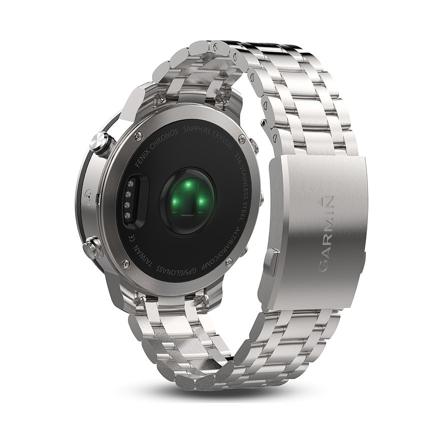 Die aus hochwertigstem Material gefertigte fenix Chronos in traditioneller Uhrmacherqualität kombiniert ein robustes Metallgehäuse mit neusten Technologien und vielfältigen Sportfunktionen. Das Ergebnis ist eine leistungsstarke GPS-Uhr, die sich privat als edles Accessoire elegant luxuriös präsentiert und gleichzeitig ideal für Outdooraktivitäten geeignet ist. Die fenix Chronos vereint elegantes Uhrendesign mit Robustheit und innovativen Funktionen, wie der Garmin Elevate™-Technologie zur Herzfrequenzmessung am Handgelenk, Smart Notifications, vielfältigen vorinstallierten Sport-Apps und erweiterten Leistungswerten für den Ausdauersport. Wer dabei vom rechten Weg abkommt, den führen bewährte Garmin Navigationsfunktionen sicher nach Hause zurück.1. In dieser innovativen High-End-Multisportuhr, die immer und überall zu Ihrem Stil passt, trifft Spitzenleistung auf hochwertiges Design in Juweliersqualität.