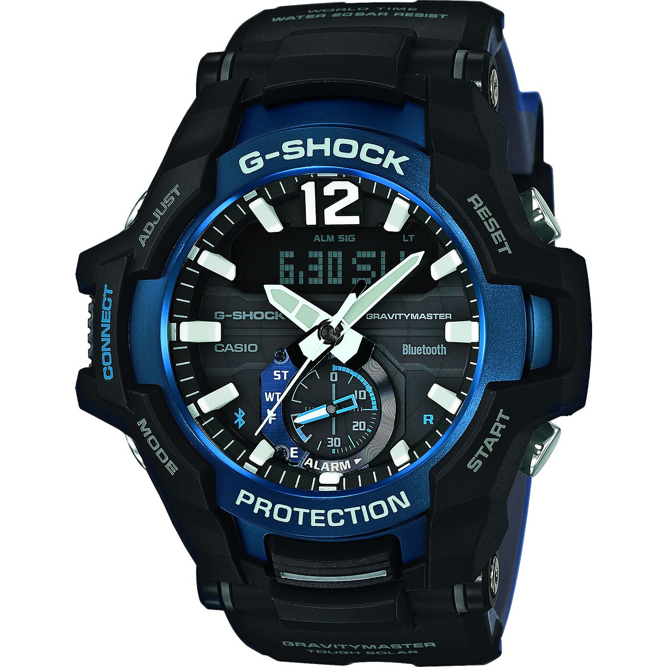 Robust, sportlich, tough, trendbewusst: Die G-SHOCK Uhren beeindrucken durch Charakter. CASIO lässt sich für die Kreation der Modelle von unterschiedlichen urbanen Jugendkulturen inspiriert. Das Ergebnis: Ein markantes Design, die unverwechselbare farbige LED-Beleuchtung und viele technische Extras, die die Uhren so besonders machen. Auch bei dem G-SHOCK Gravitymaster wartet CASIO mit herausragender Qualität und ansprechendem Design auf. Das robuste schwarze Gehäuse in typischem G-SHOCK-Style wird durch kühle blaue Elemente gehighlightet, das edle Resin-Armband aus Kunstharz ist durch seine extreme Haltbarkeit und seine Flexibilität perfekt für Männer, die es lieben, aktiv zu sein. Mithilfe von Thermometer, Stopp-Funktion und enormer Wasserdichtigkeit steht Ihrem nächsten Ausflug in die Natur nichts mehr im Wege.