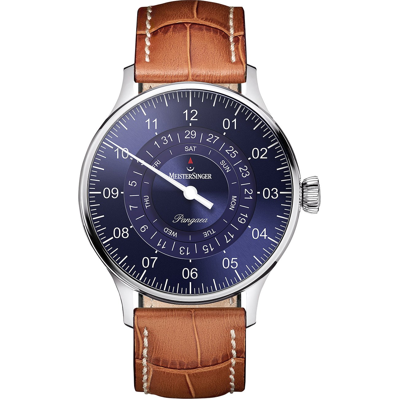 Mit diesem außergewöhnlichen Zeitmesser geht die Uhrenmanufaktur MEISTERSINGER zurück zu den Anfängen der Uhrmacherkunst und zeigt auf beeindrucke Weise, wie charmant es sein kann, die Zeit auf die einfachst mögliche Weise zu lesen. Charakteristisch sind die rundum zweistelligen Stundenzahlen sowie der einzelne Stundenzeiger, dessen nadelfeine Spitze die Zeit anzeigt. Das blaue Zifferblatt dieser Herrenuhr ist mit ihrem übersichtlichen Tag- und Datumsring der Gegenentwurf zu überfüllten Terminkalendern. Höchst widerstandsfähiges Saphirglas schützt das Innenleben, während das Armband aus braunem Kalbsleder die Uhr zuverlässig am Handgelenk hält.