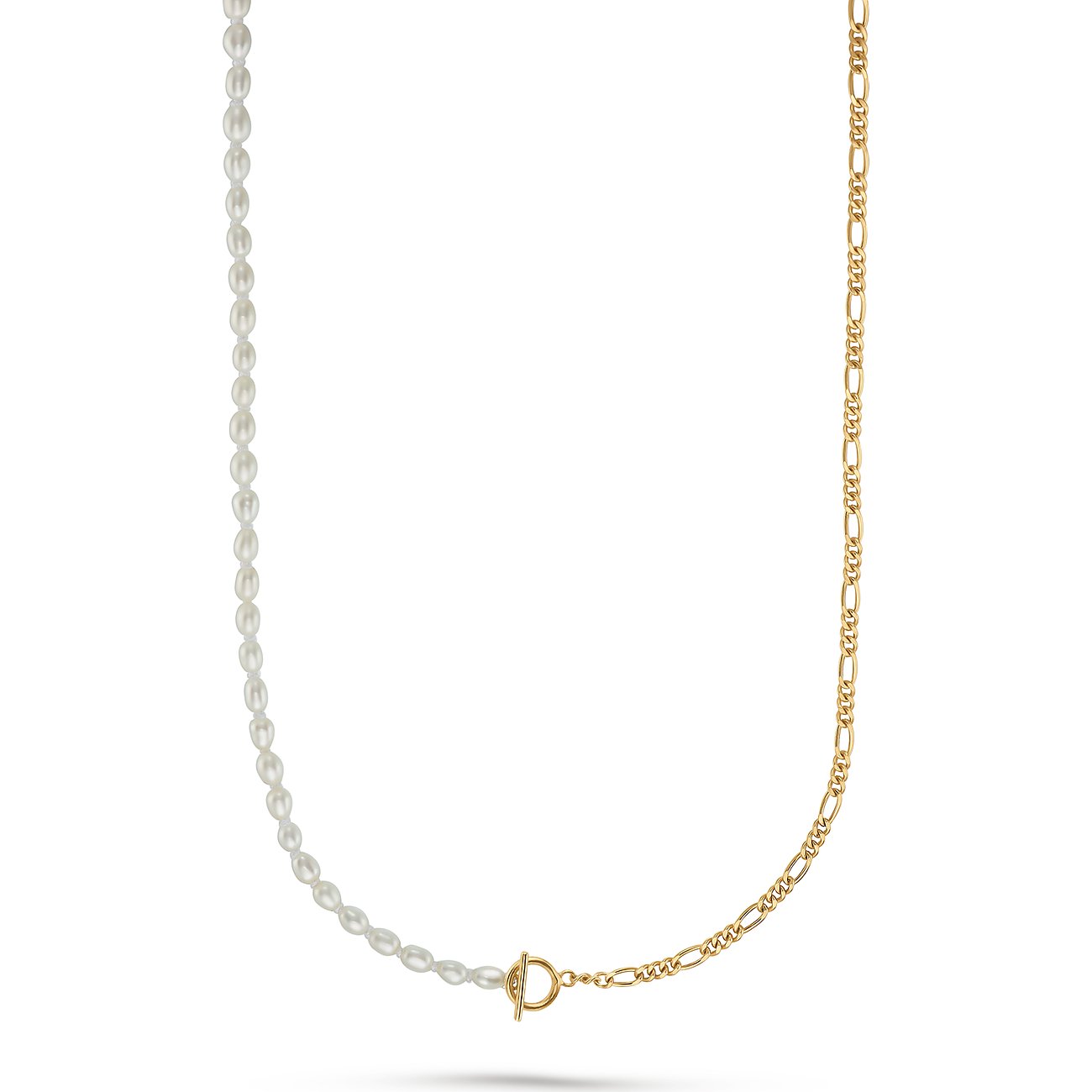 Wenn jemand die Kunst des originellen Halsschmucks beherrscht, dann auf jeden Fall CHRIST Silber – hier trifft Collier auf Kette, sanft auf rockig. Beziehungsweise trifft ein geknüpfter Perlenstrang auf eine golden schimmernde Figarokette. Als i-Tüpfelchen verbindet die beiden Elemente ein formschöner Knebelverschluss. Wir lieben diesen augenzwinkernden, modernen Statement-Schmuck aus Perlen und vergoldetem Silber. Doch das extravagante Design zeigt sich auch im Alltag als ganz hervorragend tragbar.