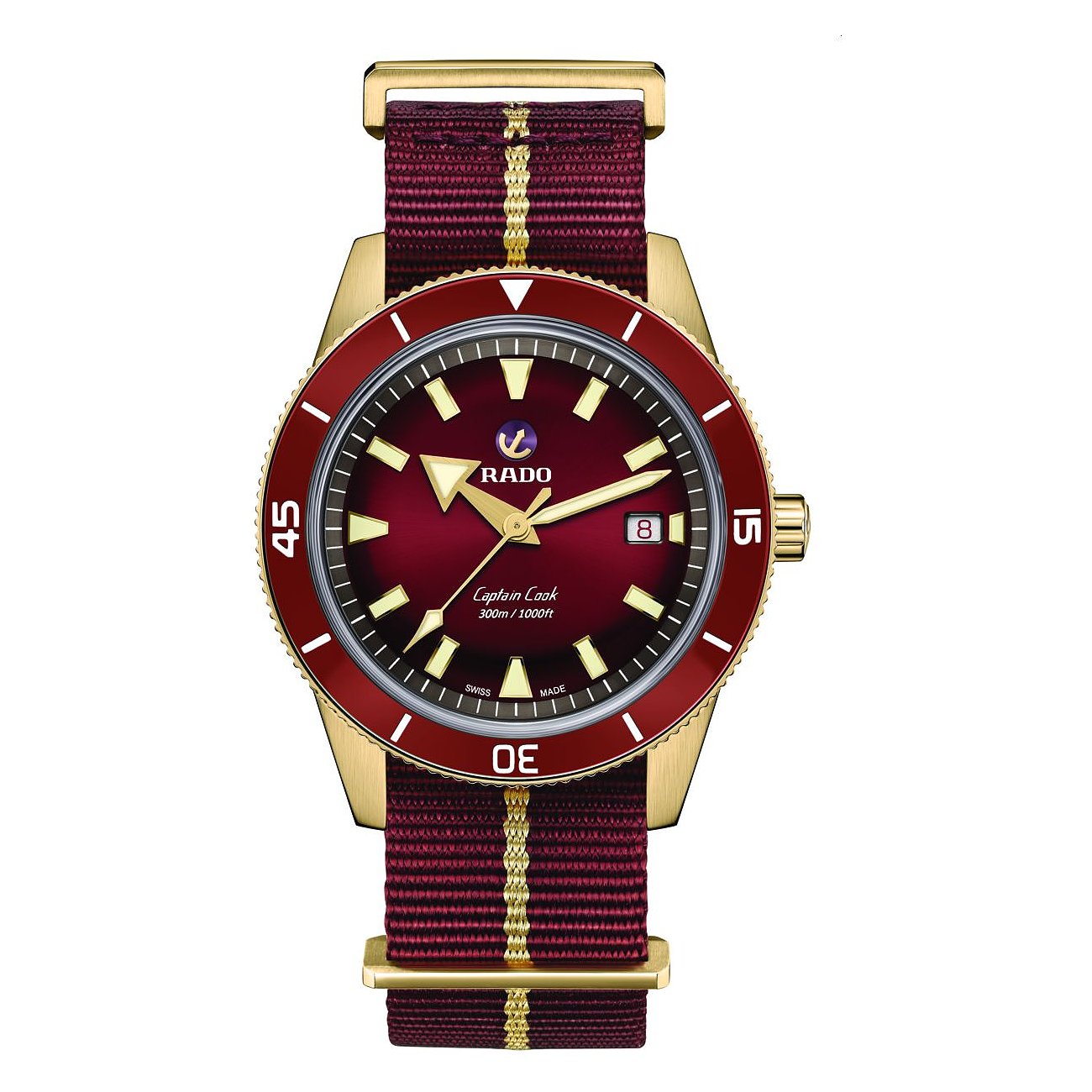 Die Marke Rado steht für Innovation, Robustheit und Design. Die Schweizer Uhrenmanufaktur setzt fortschrittliche Forschung und moderne Technologien ein, um Uhren für die Ewigkeit zu schaffen. Die Rado Captain Cook Bronze ist eine Uhr für Herren, die bei Stil und Qualität keine Kompromisse machen wollen. Das Gehäuse aus Bronze mit Keramik und das Textilband bieten einen sportlichen Look vom Office bis in die Freizeit. Obwohl diese Uhr durch einen Gehäusedurchmesser von 42 mm und einer Gehäusehöhe von 12,5 mm auffälliger und dicker ist, passt sie dennoch an eine Vielzahl von Handgelenken. Das Gehäuse erhält durch die verwendete Bronze einen besonders hochwertigen, Look, die Lünette ist drehbar und in Bordeauxfarben gehalten. Auf dem Ziffernblatt in Bordeaux sorgen Leuchtindizes für gute Ablesbarkeit auch bei schlechten Lichtverhältnissen, die Leuchtzeiger aus hell strahlender Leuchtmasse heben sich klar davon ab. Ebenfalls verfügt das Ziffernblatt über eine Datumsanzeige. Das verwendete Saphirglas ist extrem hart und dadurch sehr kratzfest. Mit einer Wasserdichte von 30 bar ist die Captain Cook Bronze bestens gerüstet für Abenteuer auf und unter dem Wasser. Krone und Gehäuseboden sind verschraubt - alles in allem eine Uhr, die höchsten Ansprüchen gerecht wird. Das verbaute Eta-Automatikwerk zieht sich durch Bewegung selbst auf. Mit einer Gangreserve von beeindruckenden 80 Stunden kann die Uhr mehrere Tage lang ungetragen bleiben, ohne neu gestellt werden zu müssen. Ein farblicher Hingucker ist das Band aus Textil in Bordeaux mit Dornschließe, durch das die Uhr sicher und bequem am Arm gehalten wird. Alles in allem eine Rado, die nichts zu wünschen übrig lässt und auf lange Jahre hinaus zum geliebten Begleiter werden wird.