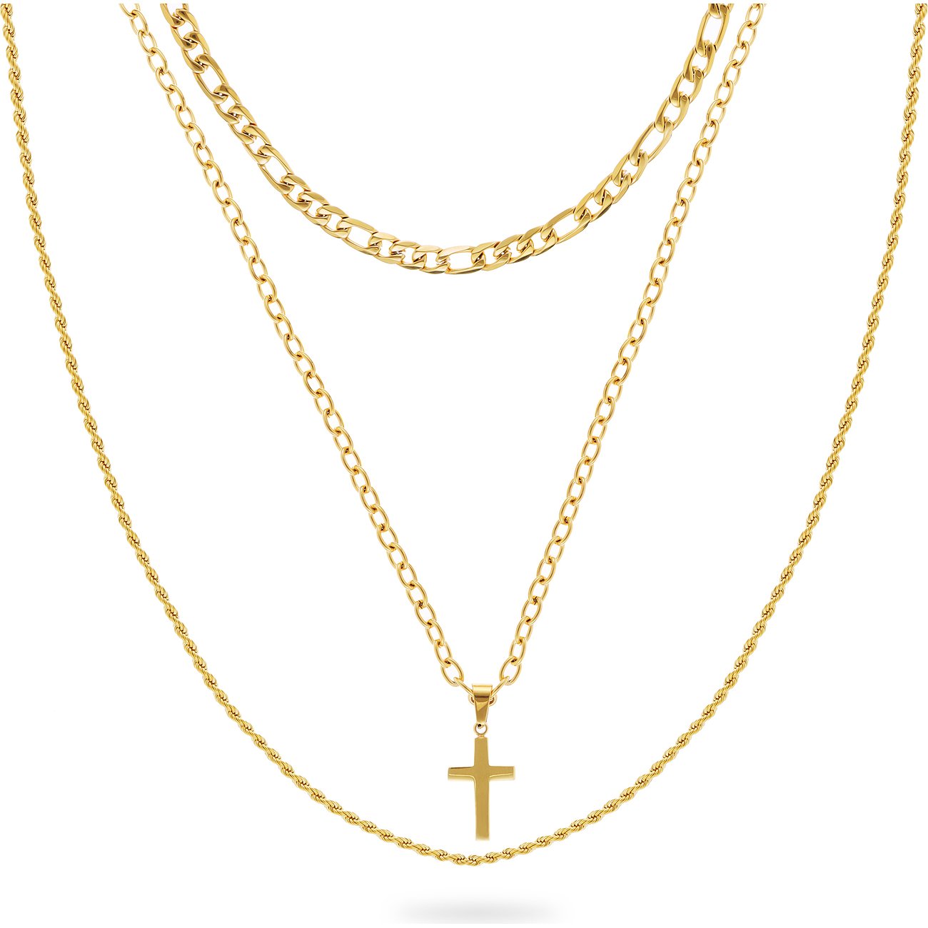 Der angesagte Layer-Look darf auch an der männlich dominierten Schmuck-Front nicht so ohne weiteres vorbeiziehen. FAVS gibt mit dieser 3-teiligen Halskette für Herren ein deutliches Statement zu diesem wahrhaft vielschichtigen Modethema ab. Die 3 Ketten wurden aus gelbvergoldetem Edelstahl gefertigt. Die mittlere schmückt ein schlichtes Kreuz als Anhänger. Ein solider Karabiner als Verschluss hält dieses Ensemble zusammen. Die Ketten können auch einzeln getragen werden.