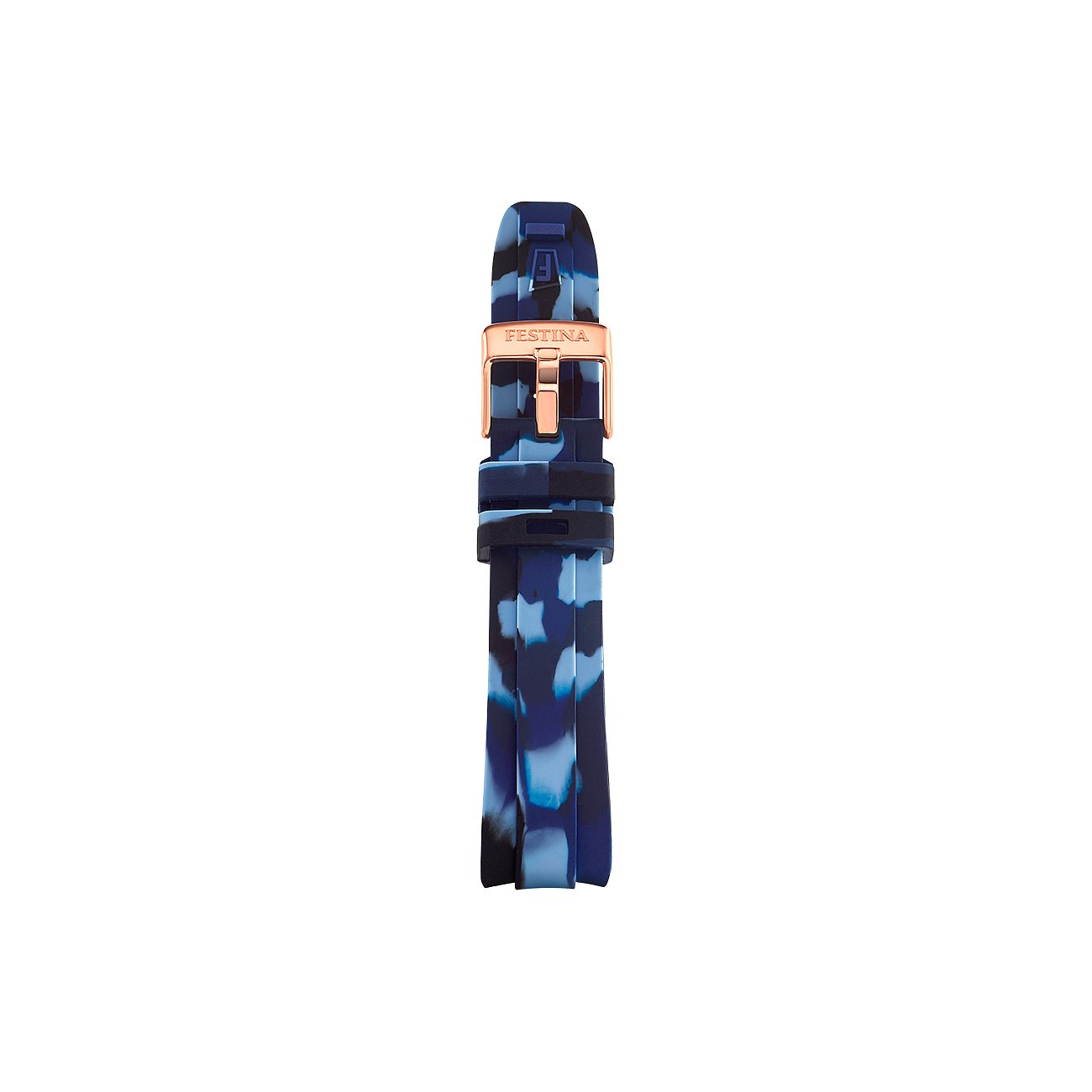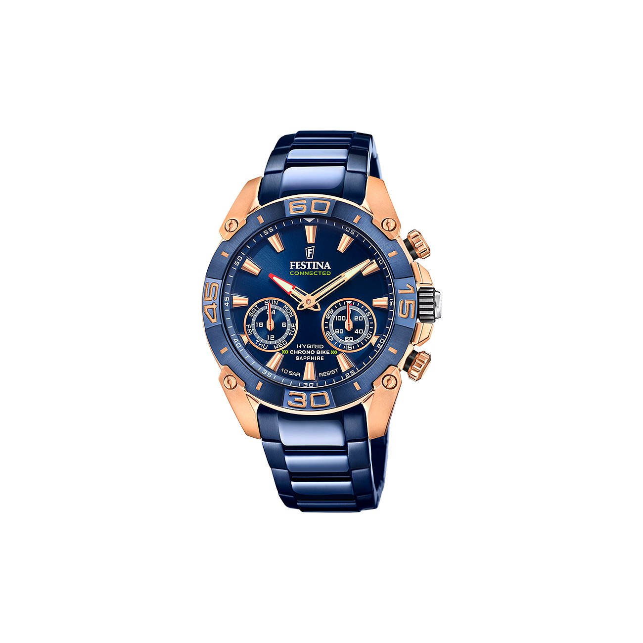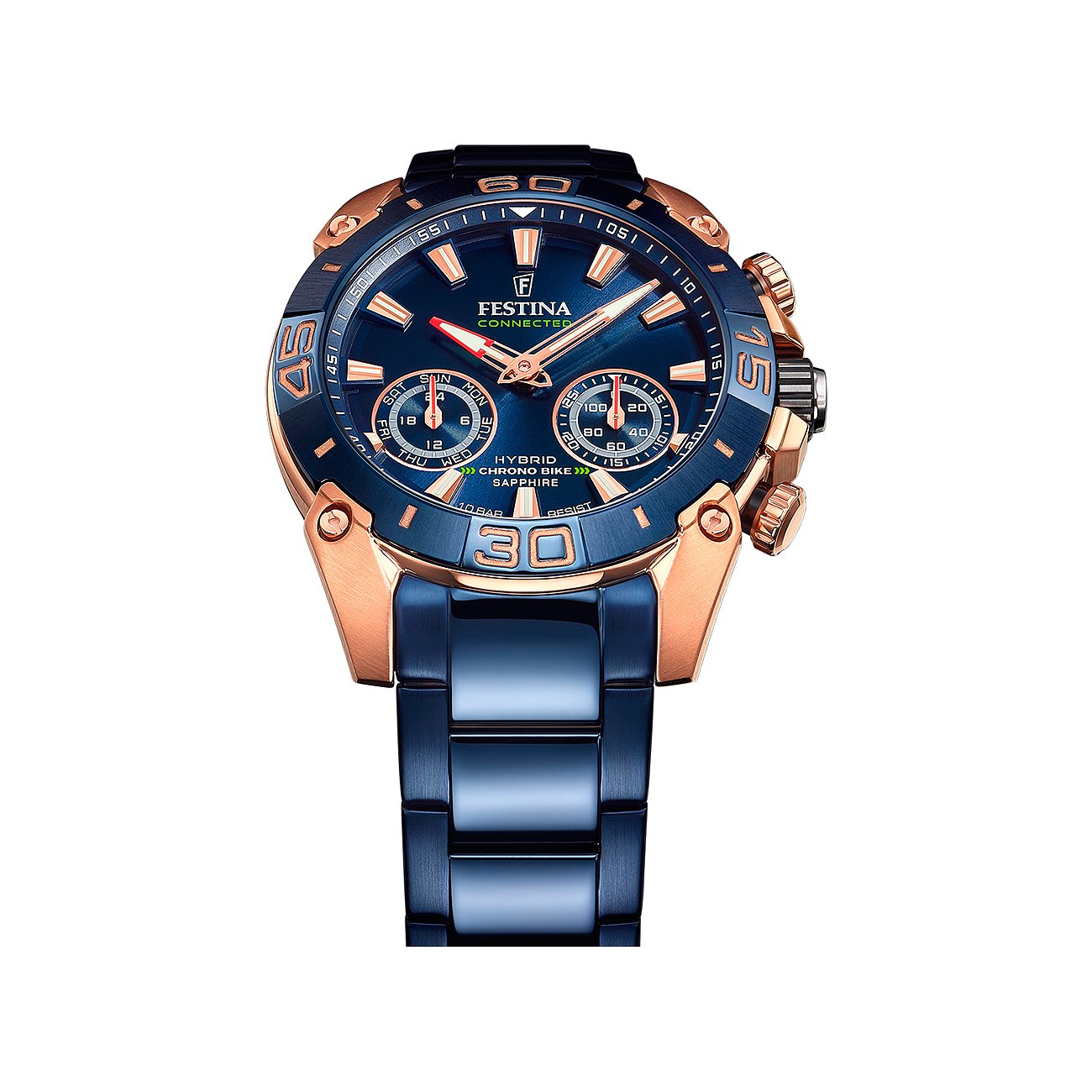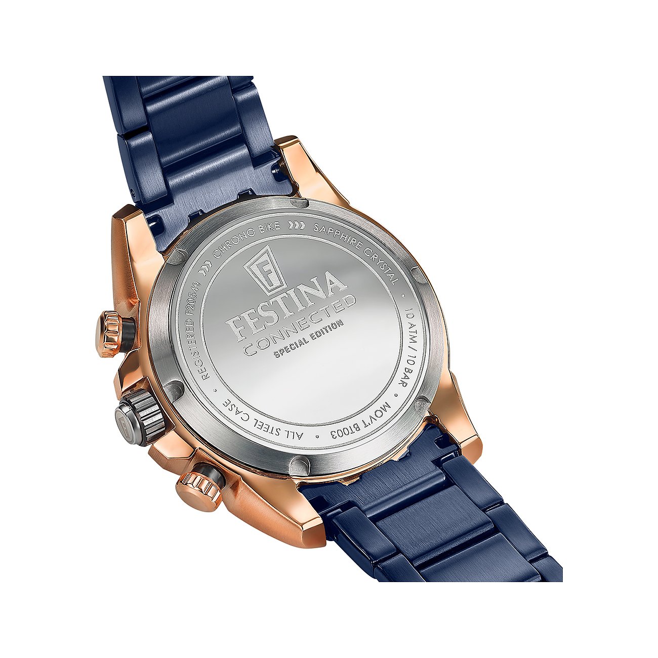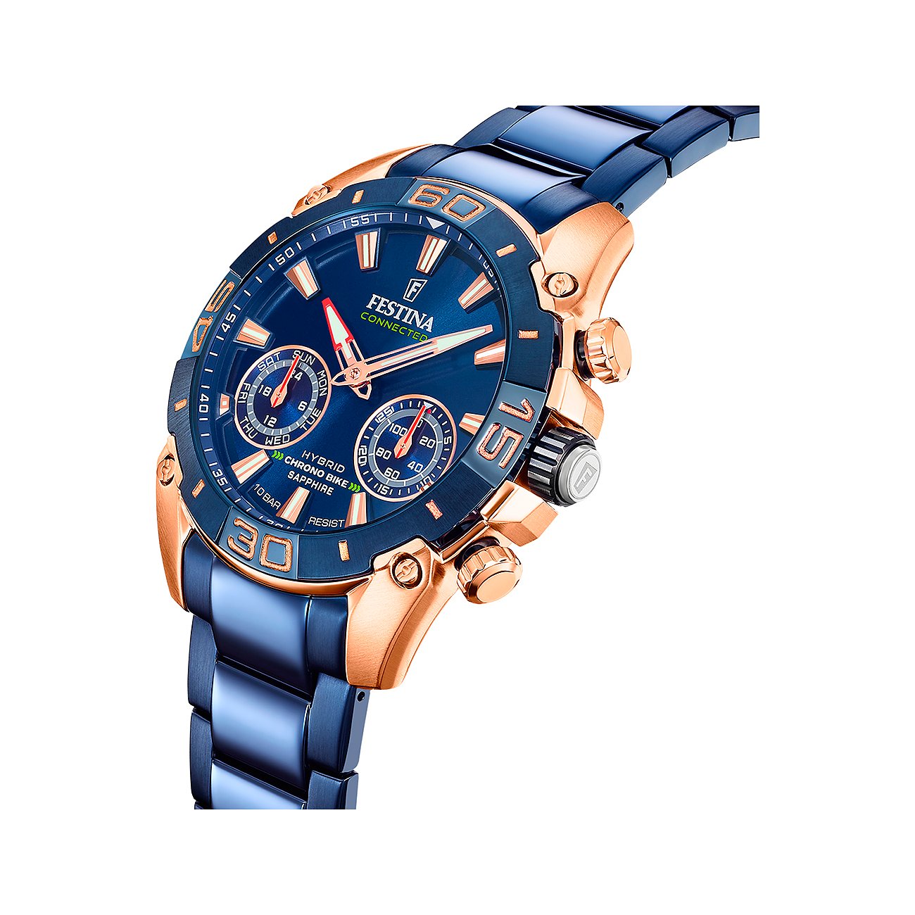 Auf die Plätze, fertig, los! Diese sportliche elegante Smartwatch von Festina wartet nur darauf, Sie in Ihrem aktiven Alltag zu begleiten. Schrittzähler, Stoppuhr, Aktivitätsziele, Timer, stiller Alarm, Musik- und Kamerasteuerung sind nur einige der Funktionen, die Sie mit diesem Herren Chronographen genießen können, sobald Sie ihn mit Ihrem Smartphone verbunden haben. Doch nicht nur technisch ist diese Uhr up-to-date, sondern auch optisch: Das Gehäuse, die Zeiger und Indizes in Roségold setzen im Einklang mit dem blauen PVD-beschichteten Edelstahl genau die richtigen modischen Akzente. Doch damit nicht genug für Freunde von modischem Chic: In diesem Set ist außerdem ein Wechselarmband im Camouflage-Look enthalten.