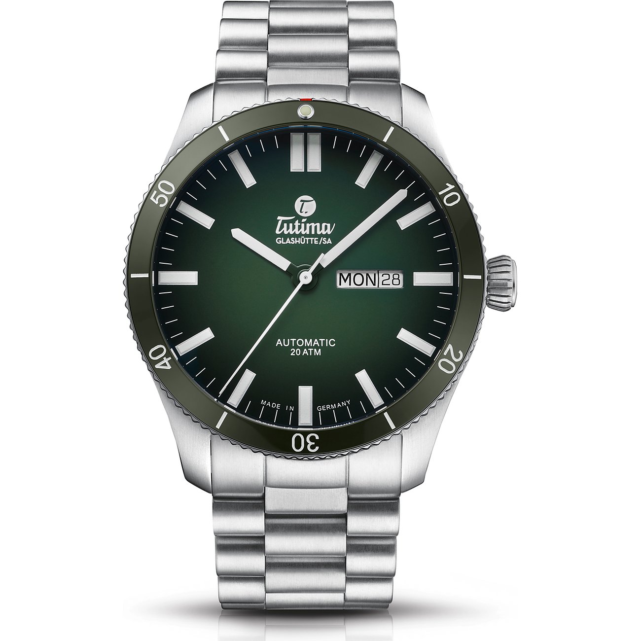 - Leuchtzeiger, Leuchtindizes, Verschraubte Krone, Verschraubter Gehäuseboden, Gehäuseboden Sichtfenster, Saphirglasboden, Austauschbares Armband