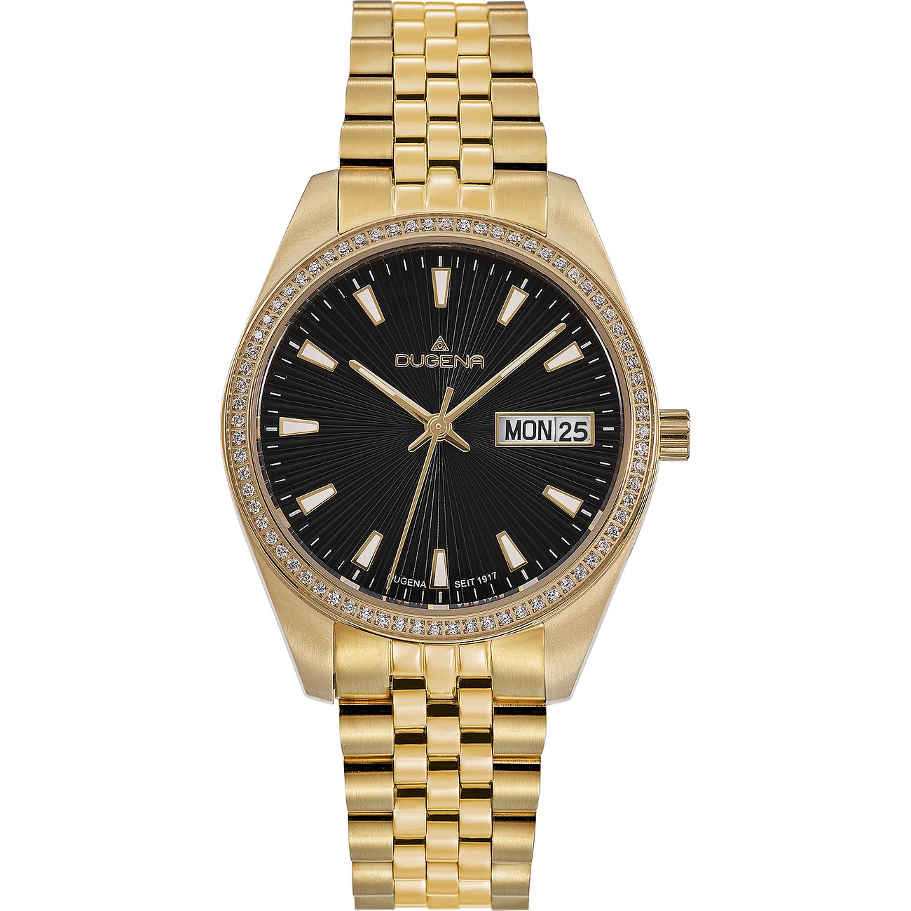 Dugena: Seit über 100 Jahren steht die deutsche Marke für Uhren im Alltag und in besonderen Momenten zuverlässig an deiner Seite. Hochwertige Materialien, modernes Design und eine klare Linie – das sind die Werte, die jede Dugena-Uhr auszeichnen. Egal ob klassisch oder modern, Dugena verbindet Tradition und Qualität für deine Zeit. Diese sportlich-elegante Uhr am gleichermaßen schicken wie robusten Edelstahl-Band ist die perfekte Wahl für jede Frau, die auf der Suche nach einem zeitlosen Klassiker ist. Das schwarze Ziffernblatt der Dugena Venetia Stone setzt optisch einen besonderen Akzent, während das Gehäuse, das Armband und die Lünette einheitlich in Gold gehalten sind.