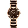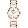 Master of Materials: Rado setzt für die ikonischen Designs seiner Uhren stets innovative und modernste Materialien ein. So vereinen alle Rado-Modelle Schönheit, Langlebigkeit und Funktionen auf die beste Art und Weise miteinander. Die Centrix ist die perfekte Wahl für alle, die faszinierende Materialien schätzen. Diese hochwertige Damenuhr mit einem Gehäuse aus Edelstahl verleiht dem Handgelenk lässigen Luxus. Durch sein stilvolles Design harmoniert der Zeitmesser mühelos mit jedem Outfit. Das zweifarbige Armband aus Edelstahl und Keramik sieht nicht nur hervorragend aus, sondern sorgt auch für ultraleichten Tragekomfort, ist besonders stoß- und kratzfest sowie antiallergen und korrosionsbeständig. Vor allem an schmalen Handgelenken macht die Centrix mit einem Gehäusedurchmesser von 35 mm eine gute Figur. Das silberfarbene Zifferblatt verleiht der Uhr ein chices Aussehen. Eine glamouröse Note bringen die 12 funkelnden Diamanten ins Spiel. Mit dem Zeitmesser haben Sie neben der Uhrzeit auch das Datum immer im Blick. Perfektioniert wird das Gesicht der Uhr durch die roségoldene Lünette. Das Zifferblatt wird von robustem, kratzresistentem sowie stoßunempfindlichem Saphirglas geschützt. Für zuverlässige Präzision sorgt das Eta-Werk im Inneren. Es wird durch die natürlichen Bewegungen des Handgelenks aufgezogen. Die beeindruckende Gangreserve von 80 Stunden sorgt auch dann für leistungsfähiges Durchhaltevermögen, wenn die Uhr einmal längere Zeit nicht getragen werden sollte. Spannende Einblicke in die Arbeit des Uhrwerks erhält man dank des stabilen Saphirglasbodens auf der Rückseite. Der Zeitmesser ist mit einer Wasserdichte von 5 bar ausgestattet und kann so problemlos auch in der Badewanne getragen werden. Sicheren Halt und gute Verstellbarkeit garantiert die Butterfly-Faltschließe.