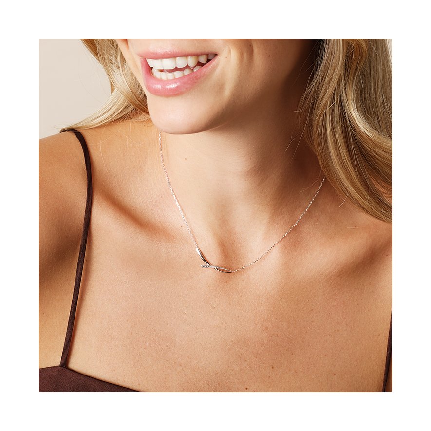 Dein Bedarf an Basics ist gedeckt und du suchst gerade ein modernes Accessoire? Diese CHRIST Kette peppt dein Schmuckkästchen stilvoll auf. Hier treffen 2 längliche, leicht geschwungene Elemente aus 375er Weißgold aufeinander. Sie kreuzen erst ihre Wege, um sich später miteinander zu vereinen. Eines der beiden Teile verfügt über kleine kugelförmige Gestaltungselemente, zwischen denen ein weißer Brillant hervorblitzt.