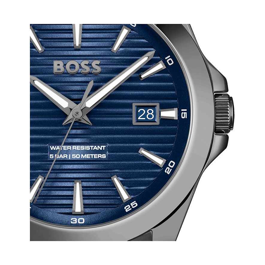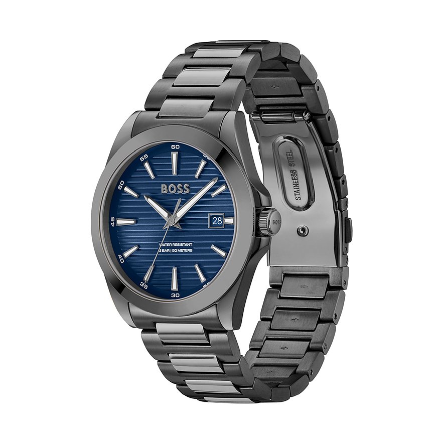 Mit ihrer Uhrenkollektion hat die Marke Boss ihr reiches Erbe mit einer tief verwurzelten Tradition in der Welt der Mode, und ihre Expertise in einer weiteren Sparte manifestiert. Diese Uhren vereinen zeitgenössisches Design mit der bewährten Zuverlässigkeit der Marke, symbolisieren Eleganz und unterstreichen die Bedeutung von Tradition in der modernen Zeitmessung. Sie sind Ausdruck von Stilbewusstsein und einem zeitlosen Verständnis für Qualität. Eine perfekte Kombination aus lässig und elegant – das ist diese Herrenuhr. Sie wird besonders durch das Edelstahl-Gehäuse und das unkomplizierte Armband aus Edelstahl geprägt. Das anthrazitfarbene Gehäuse der Boss Strike geht in ein Armband in Grau über, das Ziffernblatt ist blau.