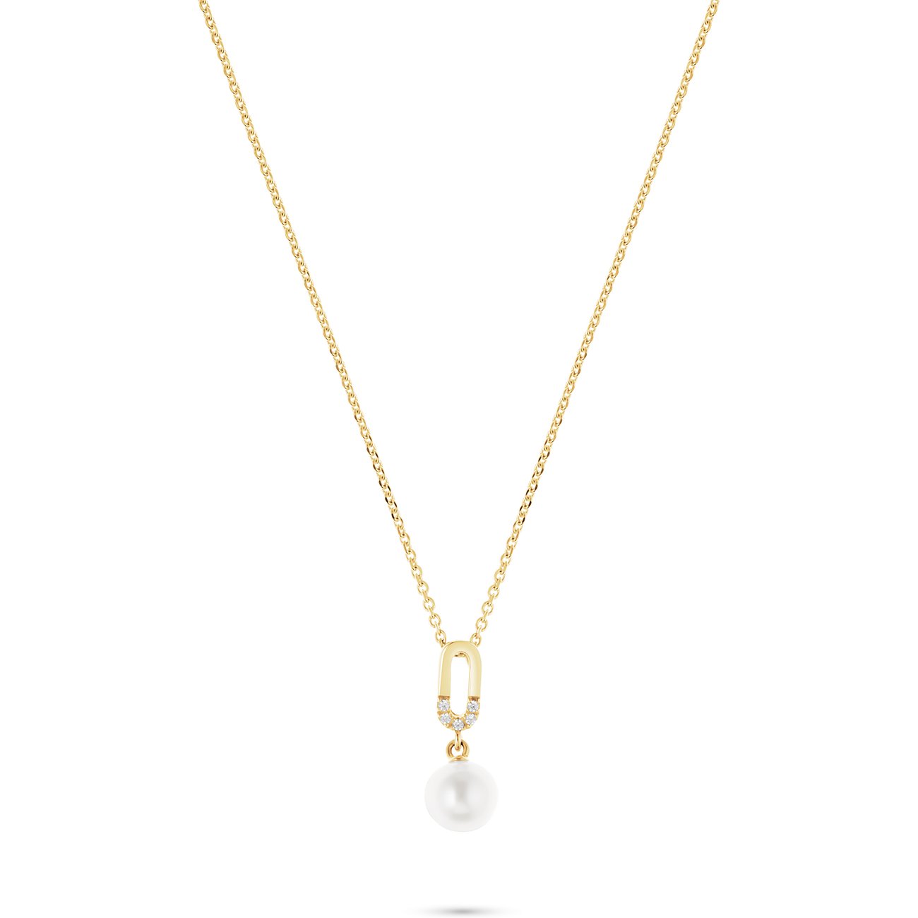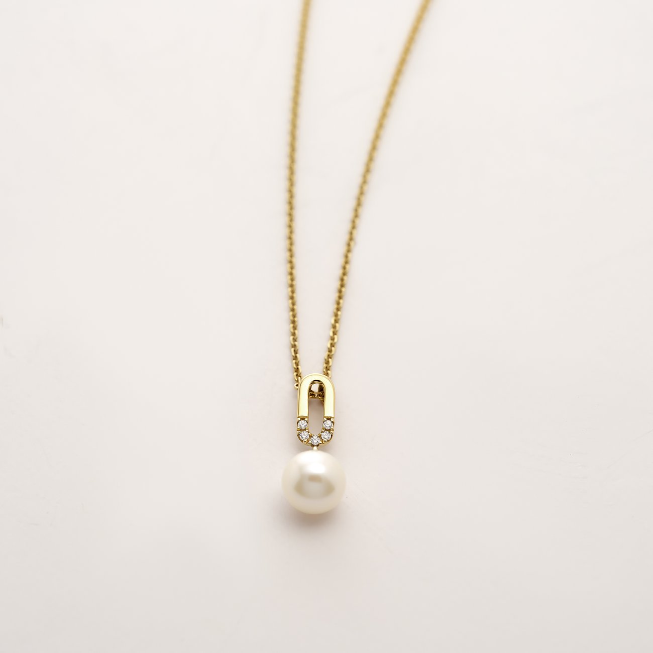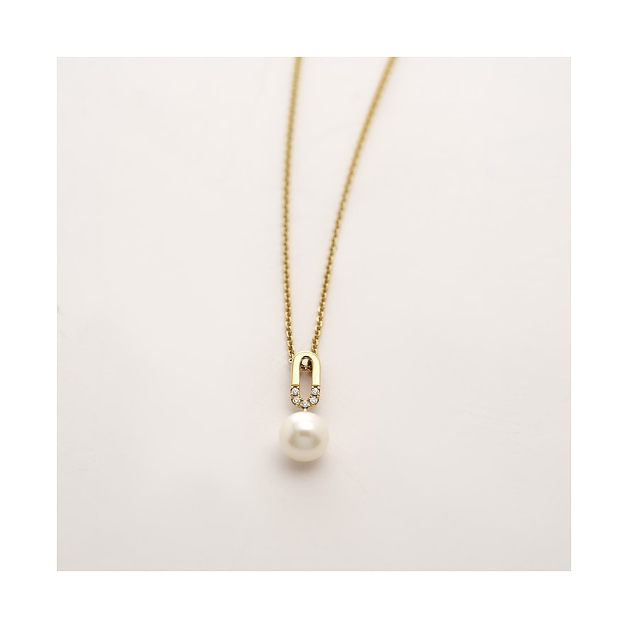 Der Anhänger selbst zeigt eine spannende Kombination aus edlen Details: Ein schmaler, länglicher Goldbogen ist mit fünf Diamanten im Brillantschliff besetzt, die in Pavéfassung funkeln und für ein feines Glitzern sorgen. Darunter schwingt eine semirunde weiße Süßwasserperle mit 5,5 mm Durchmesser – ihr zarter Lüster bildet einen schönen Kontrast zum klaren Glanz der Diamanten.