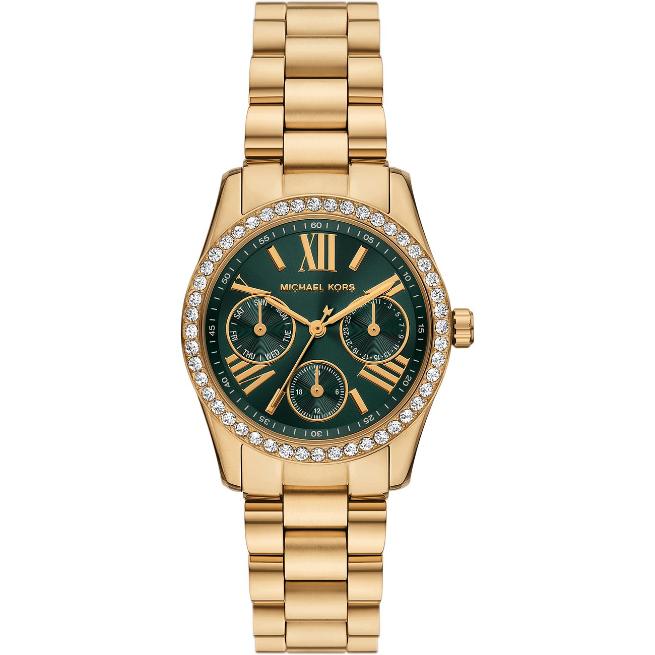 Du willst mehr, als nur die Zeit ablesen? Dann bist du mit dieser Edelstahl-Multifunktionsuhr für Frauen gut beraten! Für sportliche Eleganz sorgt das glänzende Armband aus Edelstahl. Die Michael Kors Lexington kommt in Gold daher, das grüne Ziffernblatt setzt dazu einen tollen Akzent.