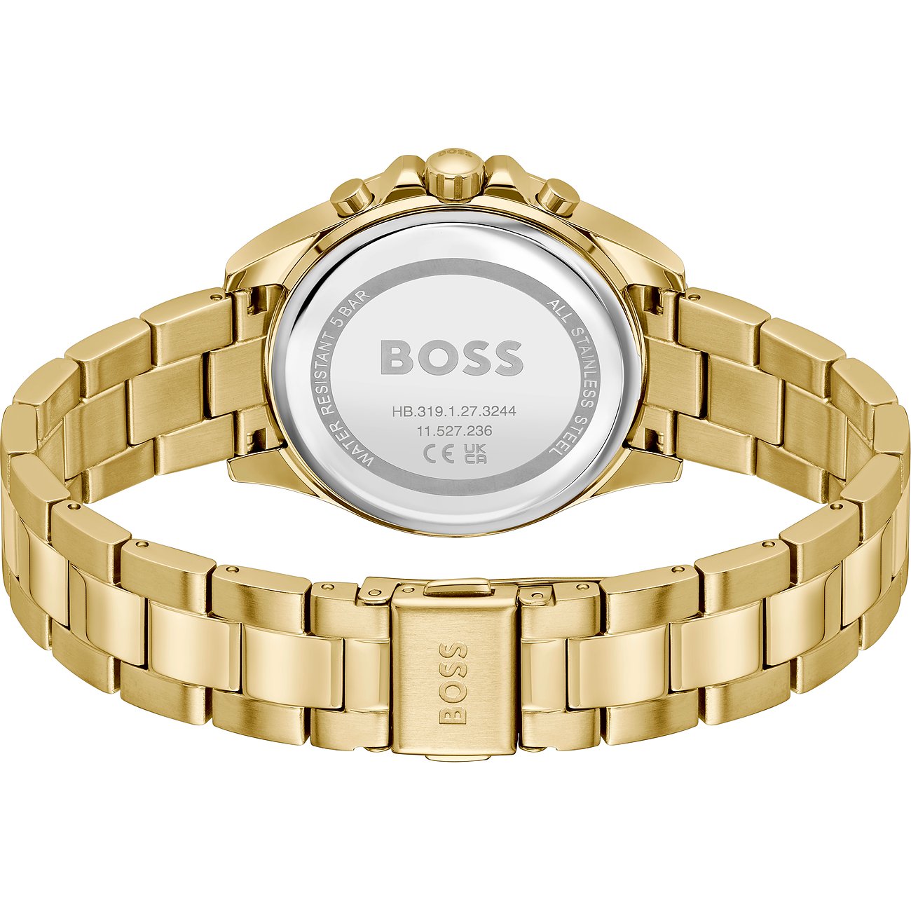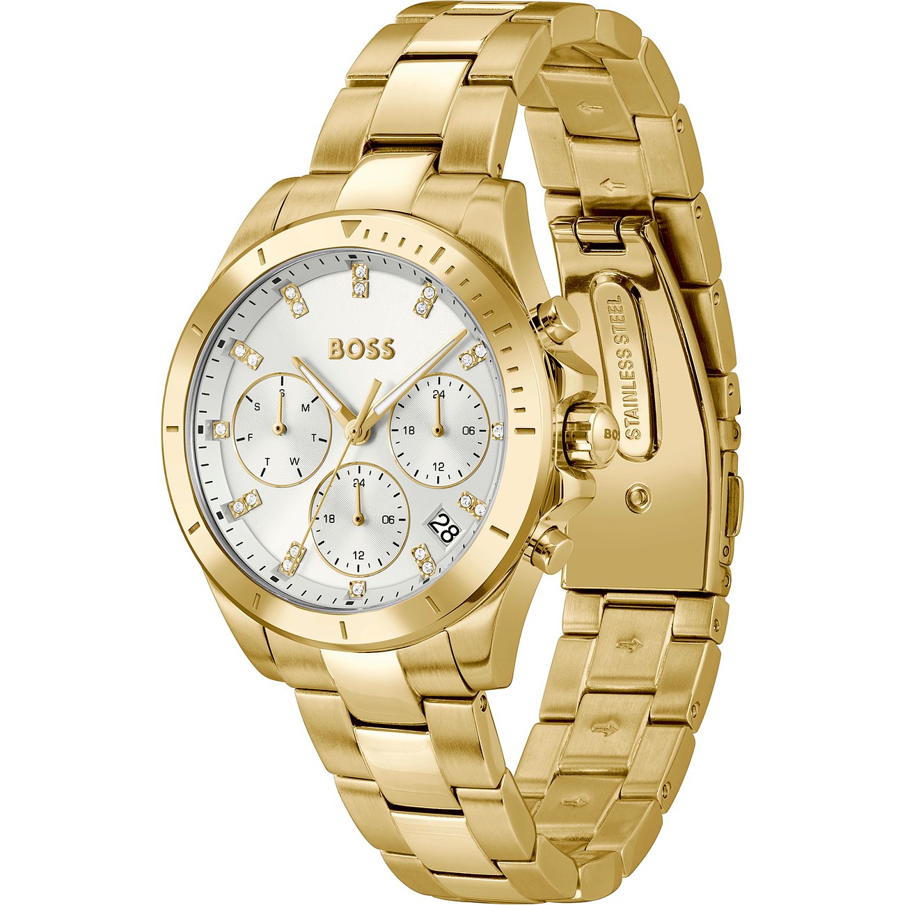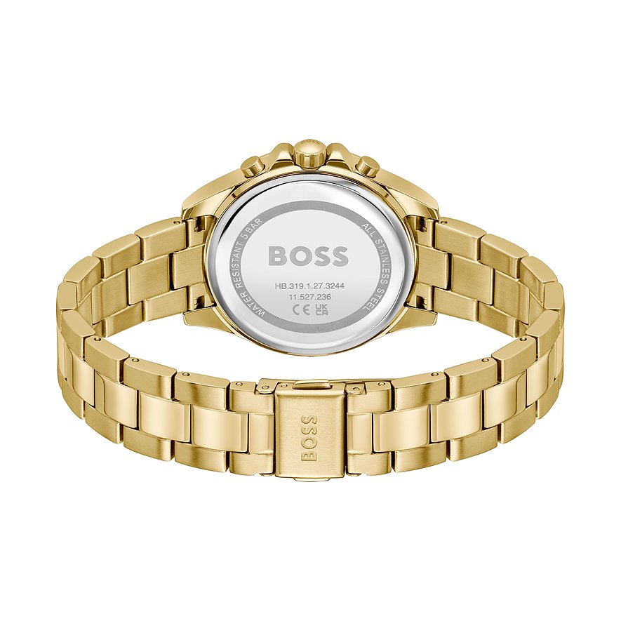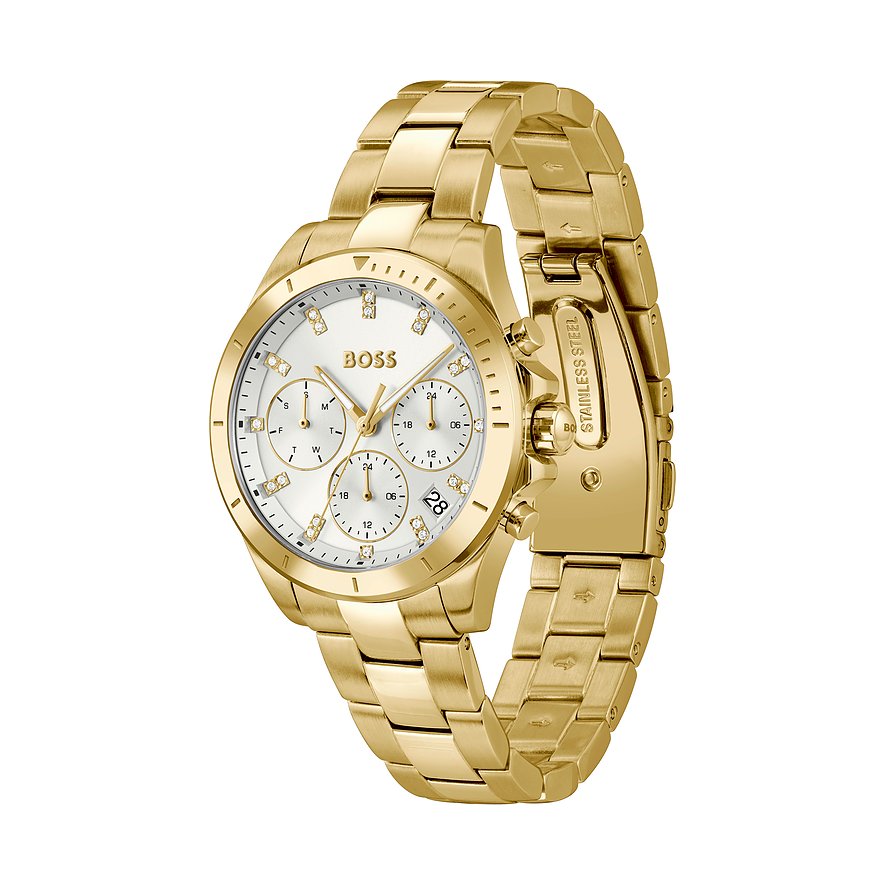 Allen, die mehr als nur die Zeit ablesen wollen, empfehlen wir diese Multifunktionsuhr für Frauen mit einem robusten Gehäuse aus Edelstahl. Das glänzende Armband aus Edelstahl sorgt für zeitlosen Charme. Gehäuse, Armband und Lünette der Boss Alley erstrahlen einheitlich in Gold, wozu das graue Ziffernblatt ein besonderer Eyecatcher ist.