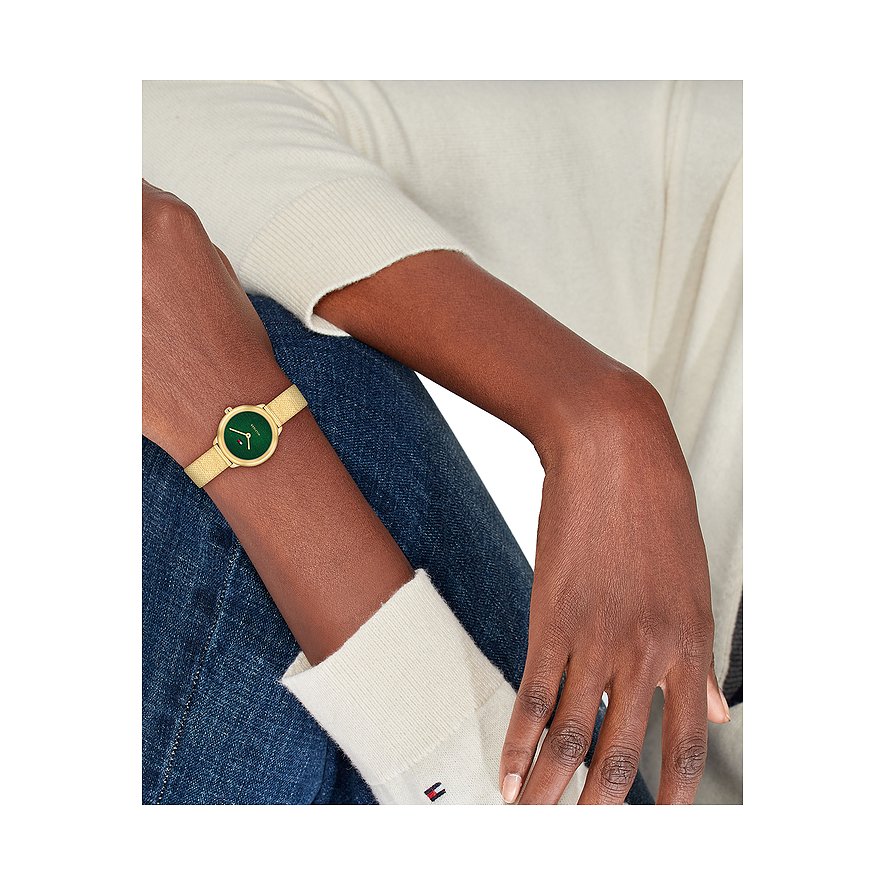 Eine perfekte Kombination aus lässig und elegant - das ist diese Damenuhr. Sie wird besonders durch das Edelstahl-Gehäuse und das robuste, aber dennoch schicke Band aus Edelstahl geprägt. Gehäuse und Armband der Tommy Hilfiger Demi sind in Gold gehalten. Das grüne Ziffernblatt ist eine harmonische Ergänzung.