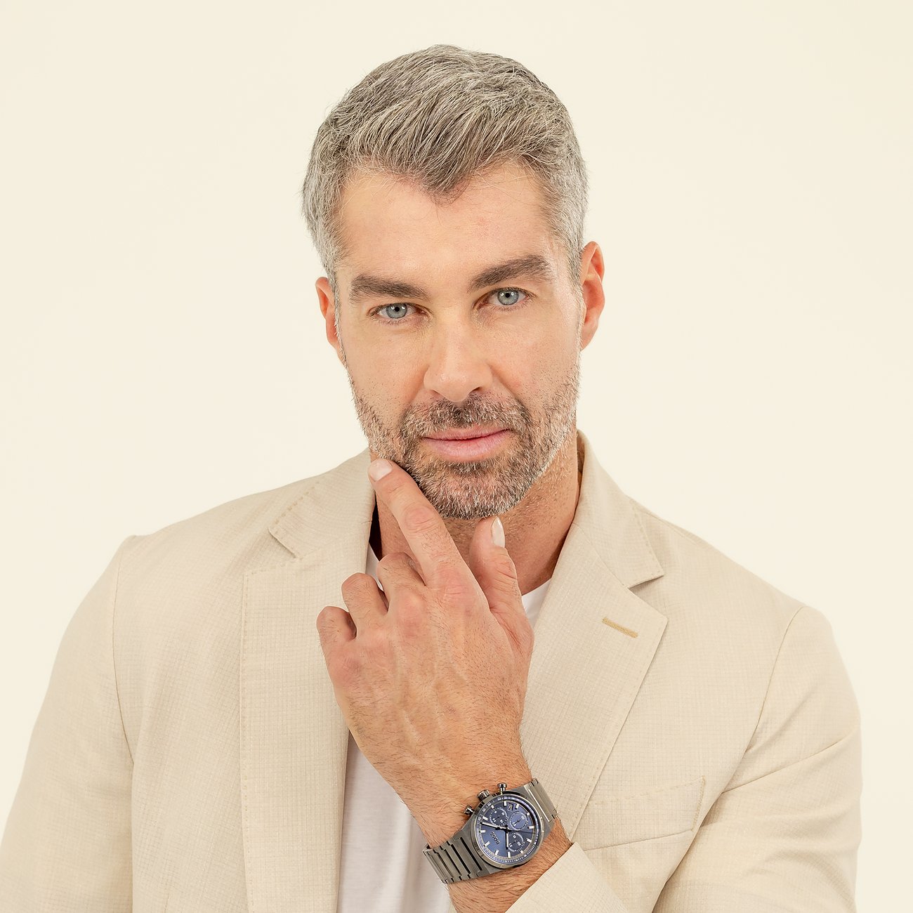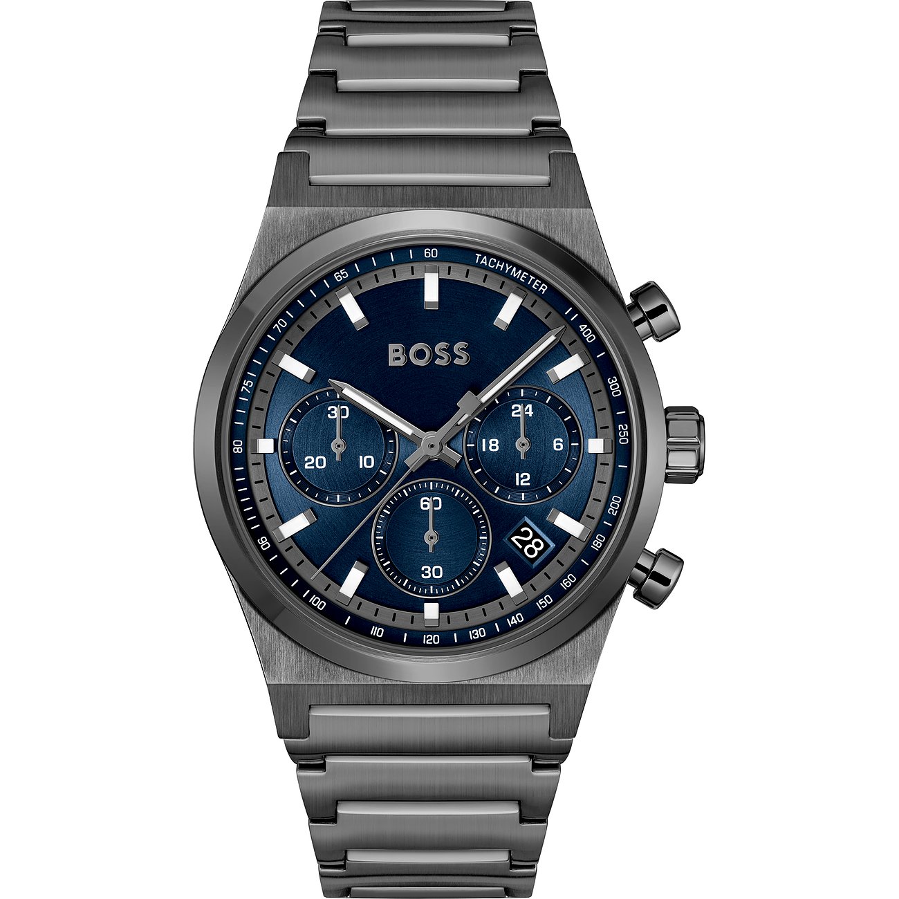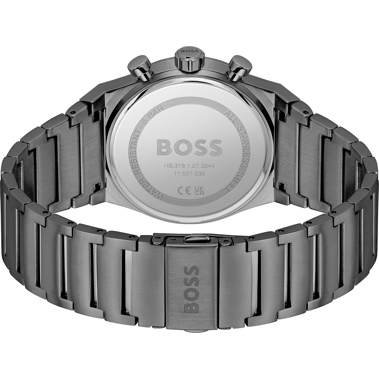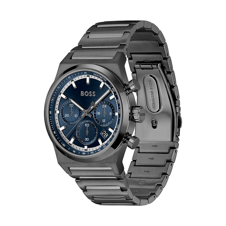 Das runde Gehäuse strahlt eine hohe Eleganz und Stilsicherheit aus. Eine leichte Ablesbarkeit der Uhrzeit wird durch die Markierungen auf dem Ziffernblatt ermöglicht. Über allem liegt ein schützendes Mineralglas. Typisch für einen Chronographen mit Hilfzifferblättern zeigt auch diese Boss die Komplikation Stoppfunktion. Elegant und robust zugleich ist das anthrazitfarbene Edelstahl-Band, das mit einer Faltschließe sicher am Handgelenk fixiert wird. Die integrierte Datumsanzeige ermöglicht es, jederzeit das aktuelle Datum schnell und einfach abzulesen. Nicht nur optisch ein Hingucker, sondern auch funktional überzeugend: Die Boss-Uhr ist bis zu 5bar wasserdicht und dank des hochwertigen Quarz-Werks von Epson äußerst präzise.
