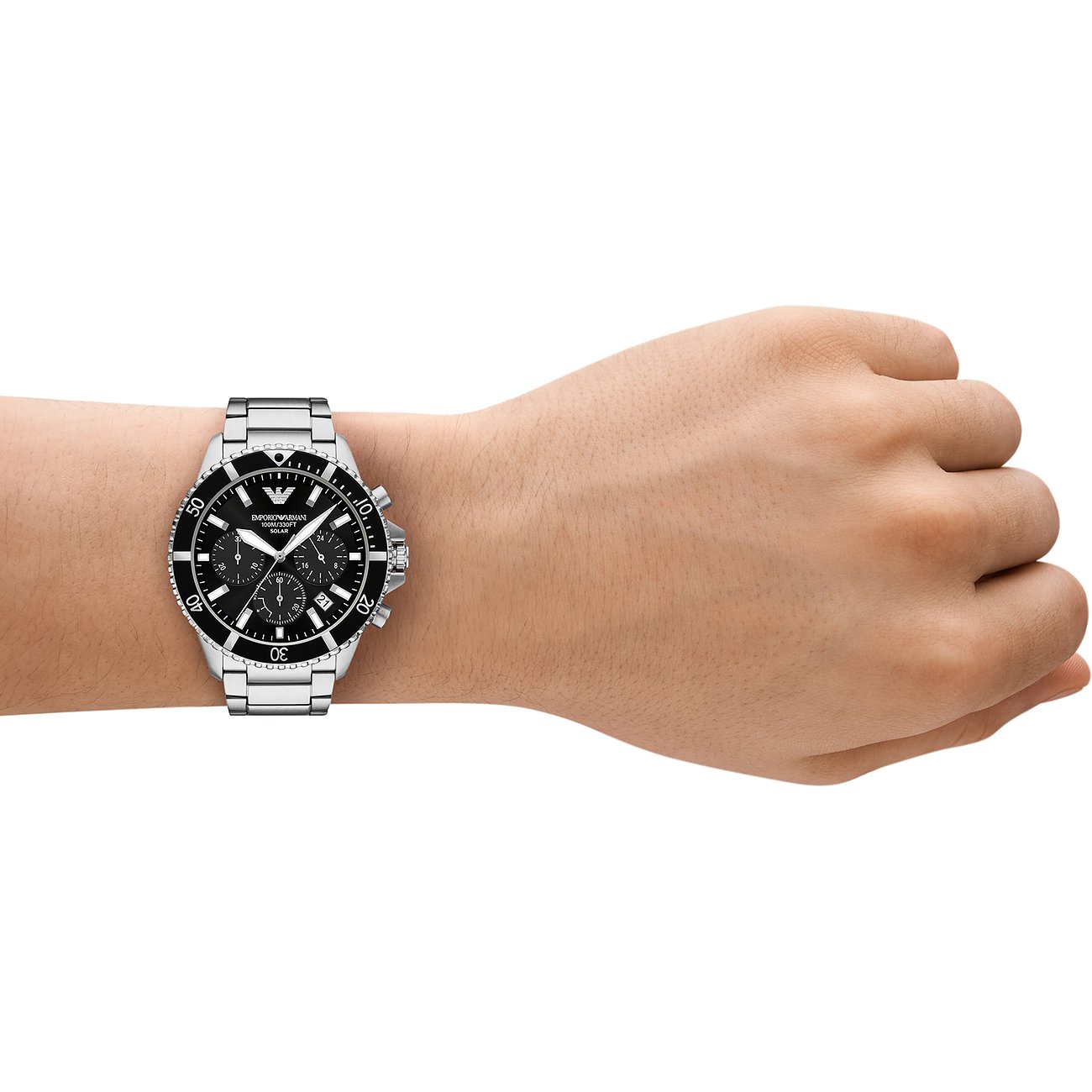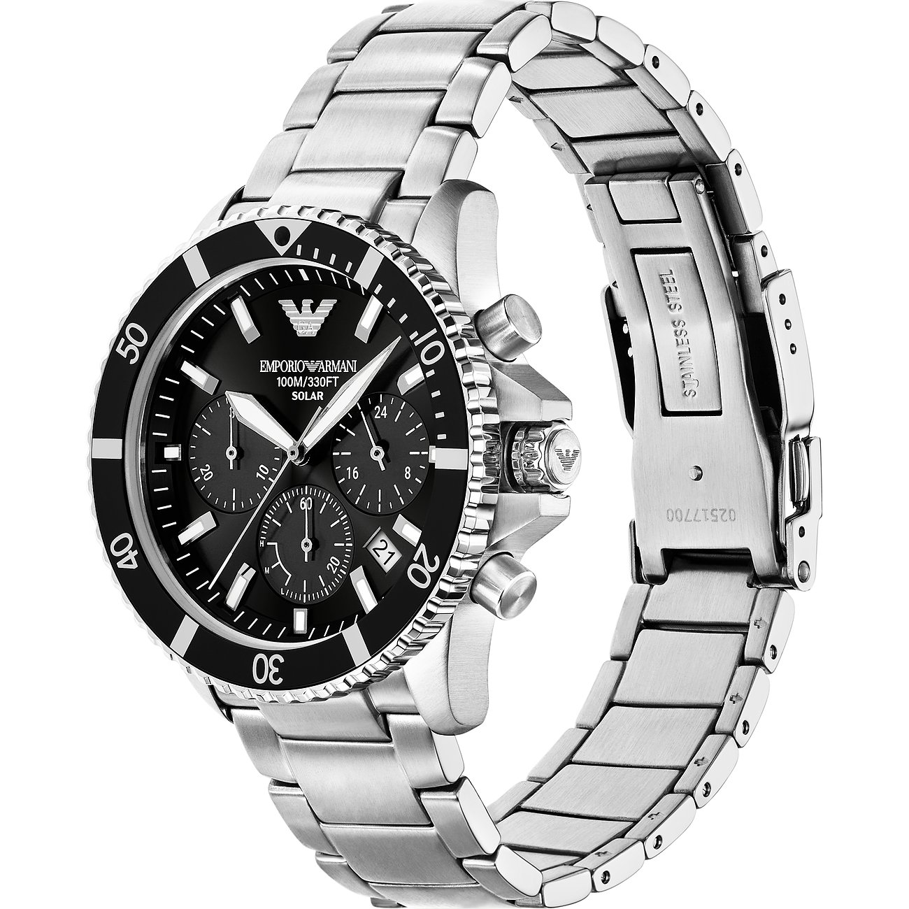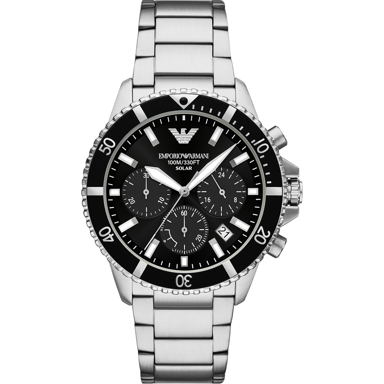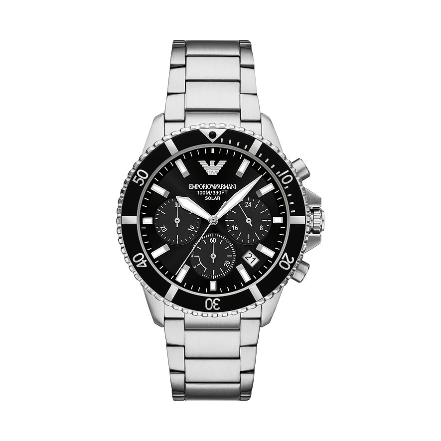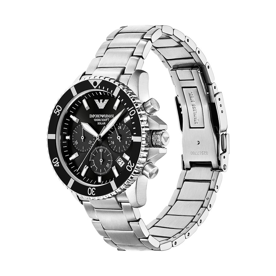 Das runde Gehäuse in coolem Schimmer wirkt stilsicher und edel. Über allem liegt ein schützendes Saphirglas. Mit seinen typischen Hilfsziffernblättern verbindet dieser Chronograph Funktionalität mit einem dynamischen Look. Die Uhr erhält durch das silberne Edelstahl-Band eine gewisse Eleganz und wird durch die Klappschließe am Platz gehalten. Präzision und Funktionalität treffen bei dieser Emporio Armani-Uhr aufeinander: Das Solar-Werk sorgt für genaue Zeitmessung und die Wasserdichte von bis zu 10bar ermöglicht unbesorgte Ausflüge ans Wasser.