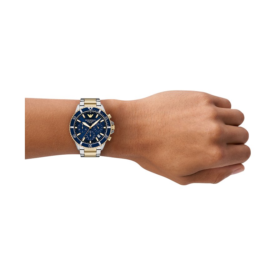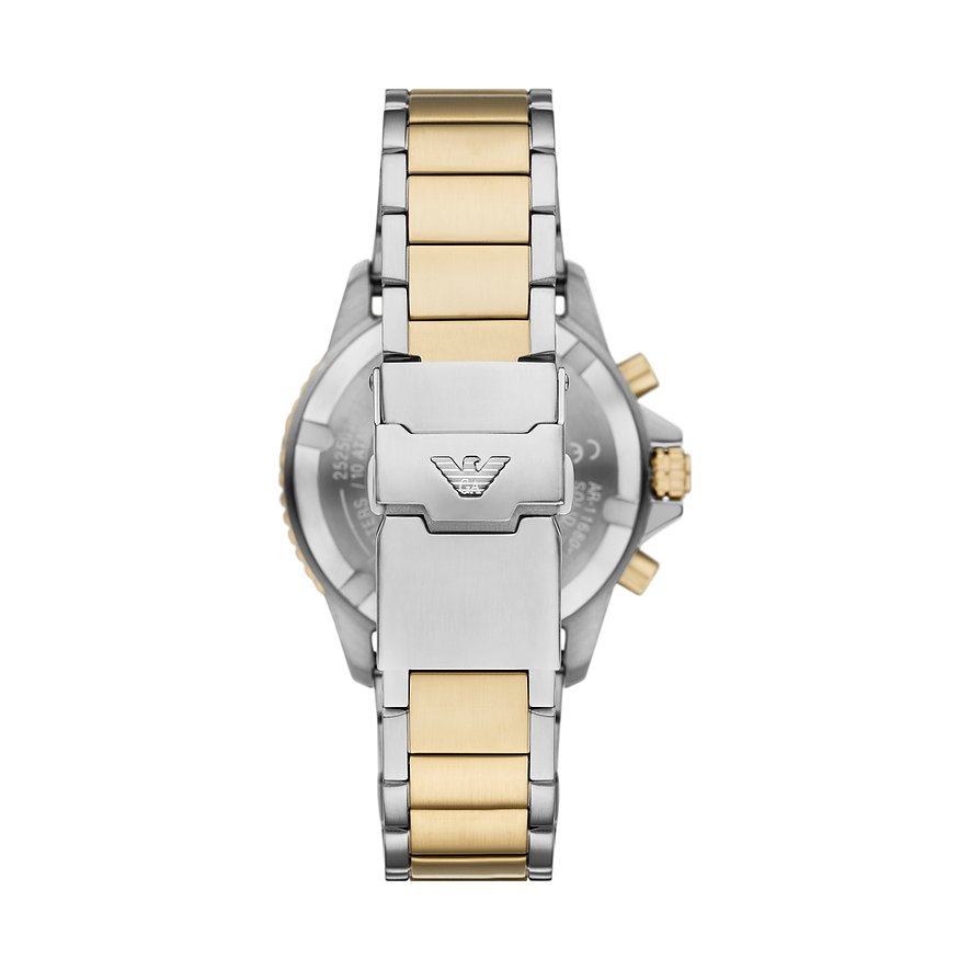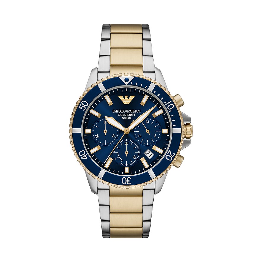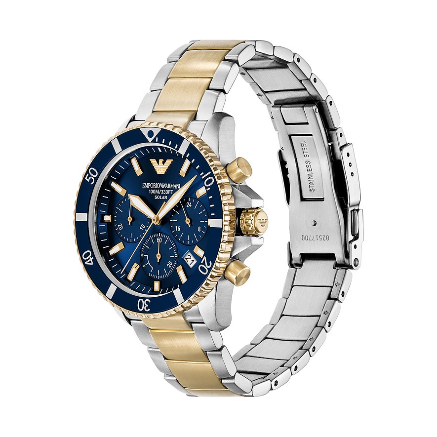 Der kühle Glanz mit dem runden Gehäuse ist immer eine stilsichere und edle Wahl. Geschützt wird das Ziffernblatt von einem robusten Saphirglas. Als Chronograph zeigt die Herrenuhr die typischen Hilfsziffernblätter, die den unverwechselbaren Chrono-Look ausmachen. Das zweifarbige Edelstahl-Band verleiht der Uhr einen Hauch von Luxus und die Klappschließe sorgt dafür, dass sie perfekt sitzt. Präzision und Funktionalität treffen bei dieser Emporio Armani-Uhr aufeinander: Das Solar-Werk sorgt für genaue Zeitmessung und die Wasserdichte von bis zu 10bar ermöglicht unbesorgte Ausflüge ans Wasser.
