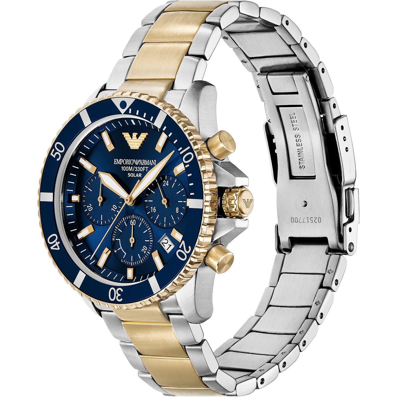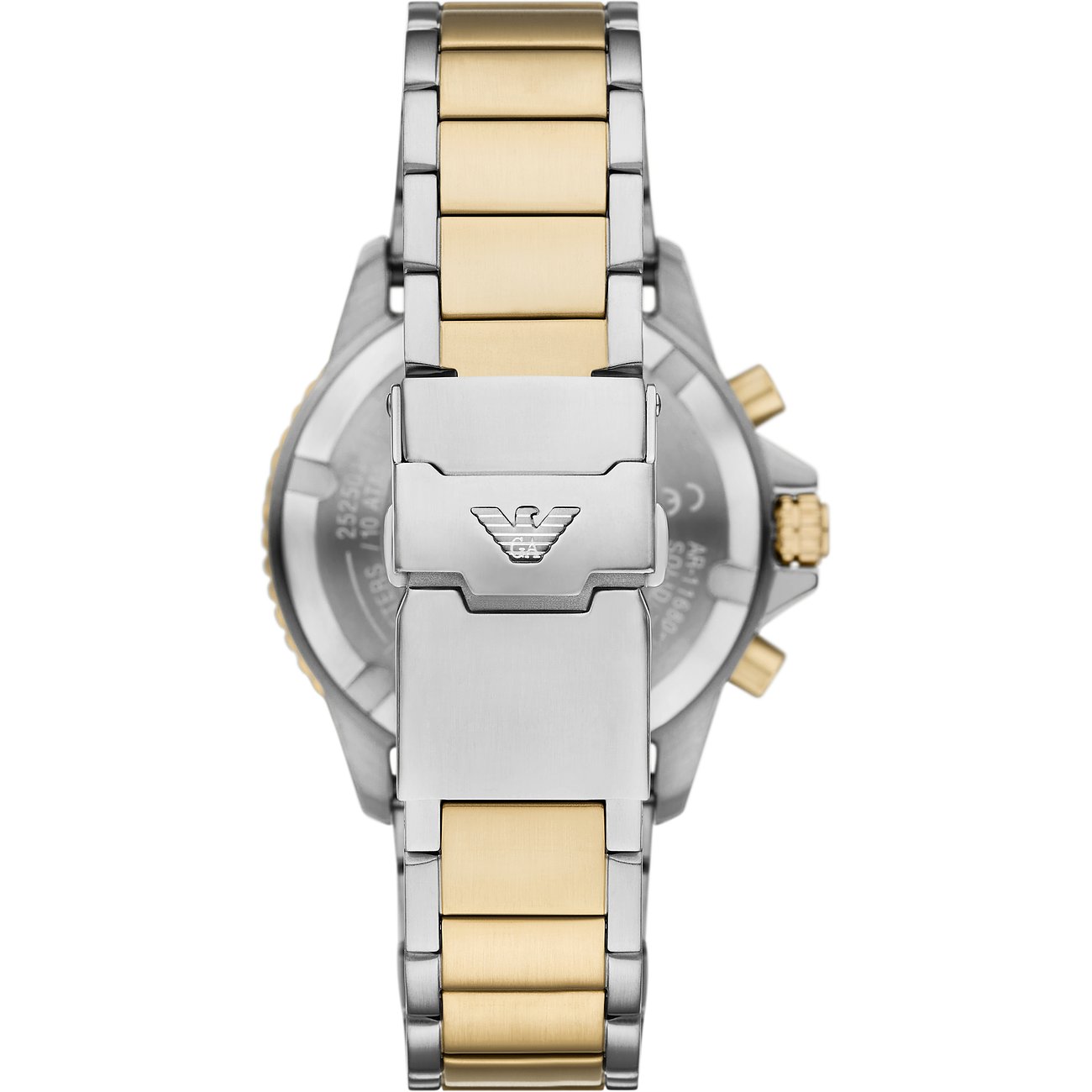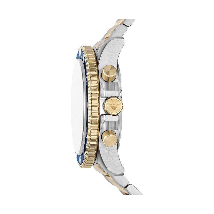 Der kühle Glanz mit dem runden Gehäuse ist immer eine stilsichere und edle Wahl. Geschützt wird das Ziffernblatt von einem robusten Saphirglas. Als Chronograph zeigt die Herrenuhr die typischen Hilfsziffernblätter, die den unverwechselbaren Chrono-Look ausmachen. Das zweifarbige Edelstahl-Band verleiht der Uhr einen Hauch von Luxus und die Klappschließe sorgt dafür, dass sie perfekt sitzt. Präzision und Funktionalität treffen bei dieser Emporio Armani-Uhr aufeinander: Das Solar-Werk sorgt für genaue Zeitmessung und die Wasserdichte von bis zu 10bar ermöglicht unbesorgte Ausflüge ans Wasser.