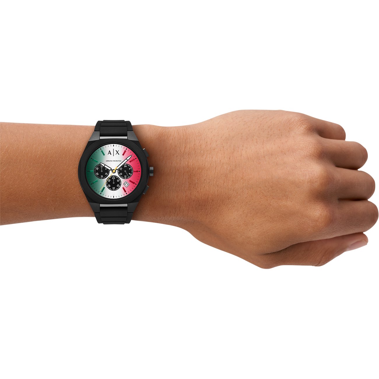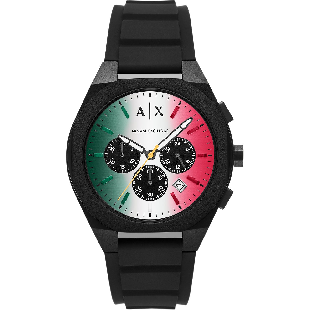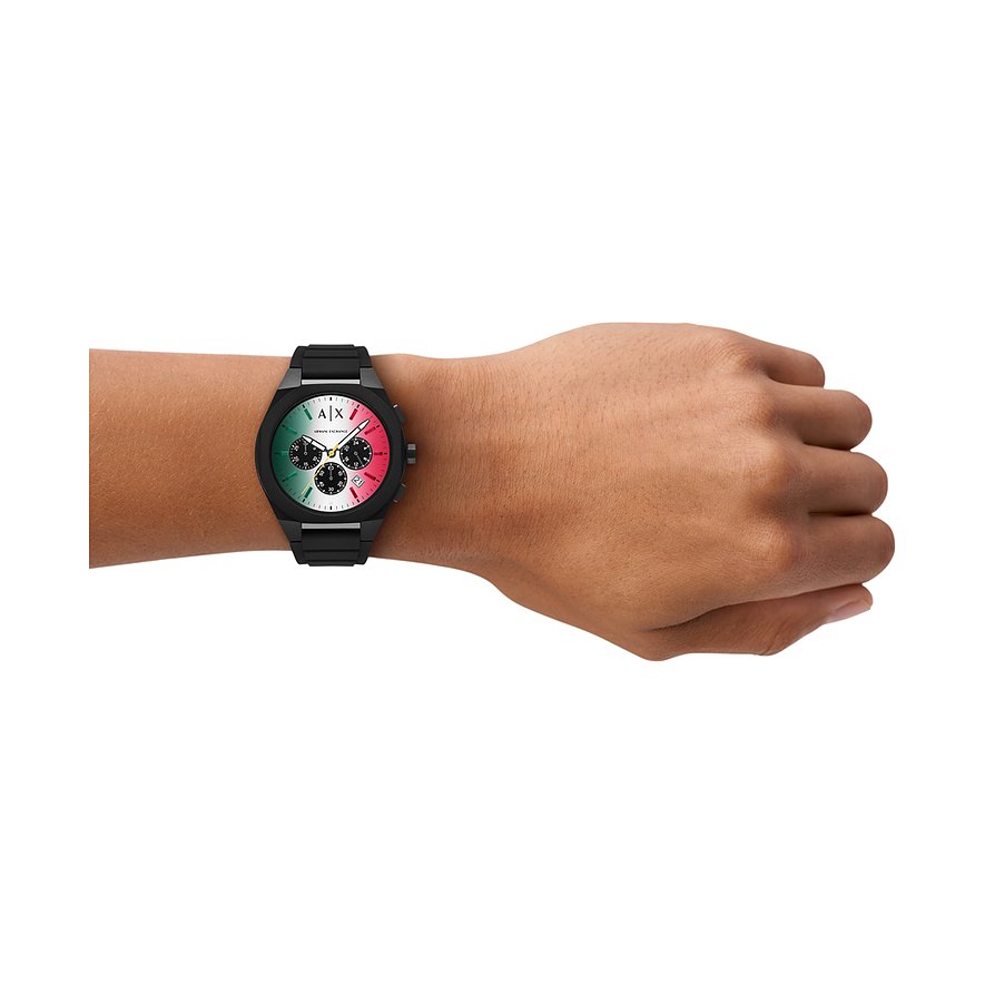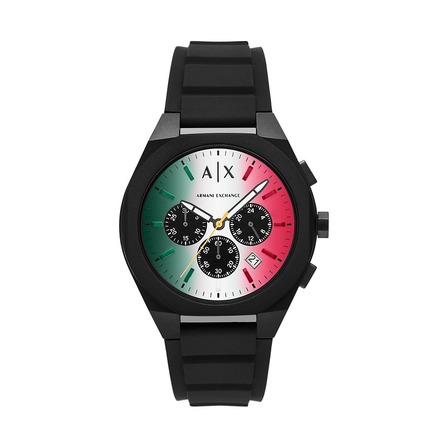 Uhren der Marke Armani Exchange, der jugendlichen Zweitlinie aus dem Hause Giorgio Armani, überzeugen mit einem von Street-Chic und Tanzmusikkultur inspirierten Stil und lassen hippe Herzen höher schlagen. Die Armani Exchange Holiday 2025 ist ein sportiver Chronograph für Männer, die bei Stil und Qualität keine Kompromisse machen wollen. Das Perlon/Nylongehäuse und das Silikonband bieten einen sportlichen Look vom Office bis in die Freizeit. Armband und Gehäuse der Armani Exchange Holiday 2025 sind beide schwarz, während das Ziffernblatt in Mehrfarbig einen besonderen Akzent setzt.