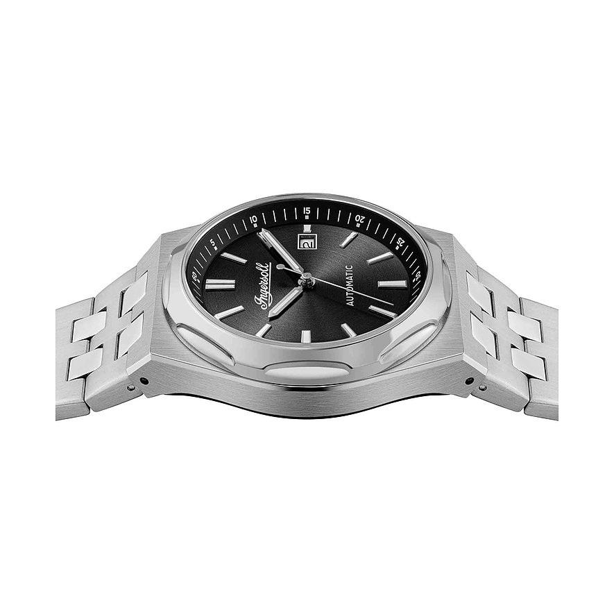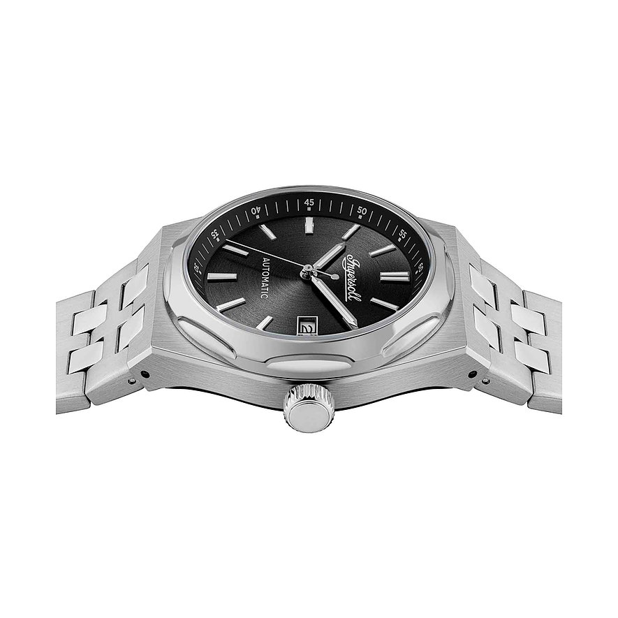 Die lässige Eleganz dieser Herrenuhr wird besonders durch das Edelstahl-Gehäuse und das Edelstahl-Band geprägt. Das schwarze Ziffernblatt der Ingersoll Fw25 The Rider setzt einen besonderen Akzent zu den ansonsten einheitlich in Silber gehaltenen Gehäuse, Armband und Lünette.